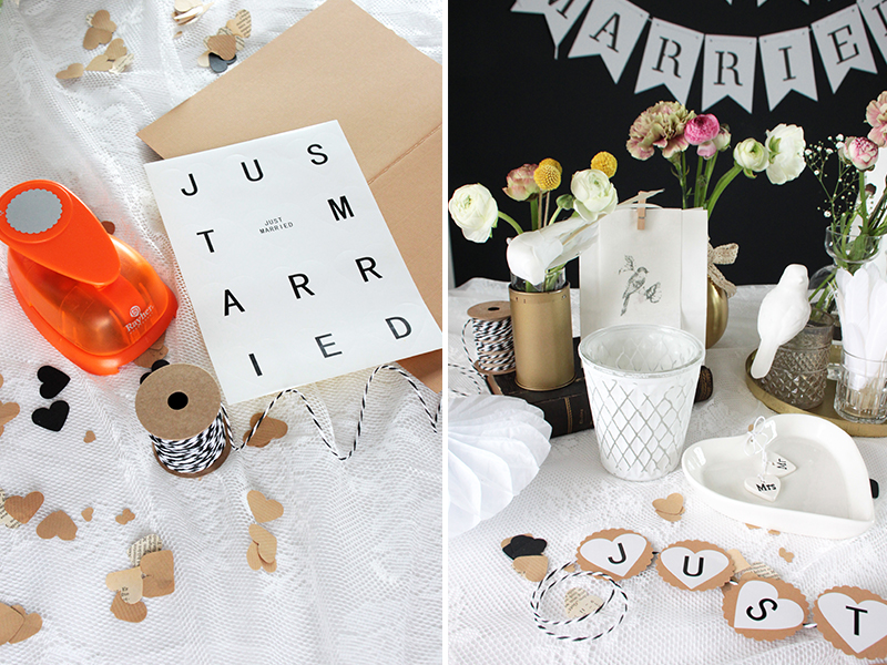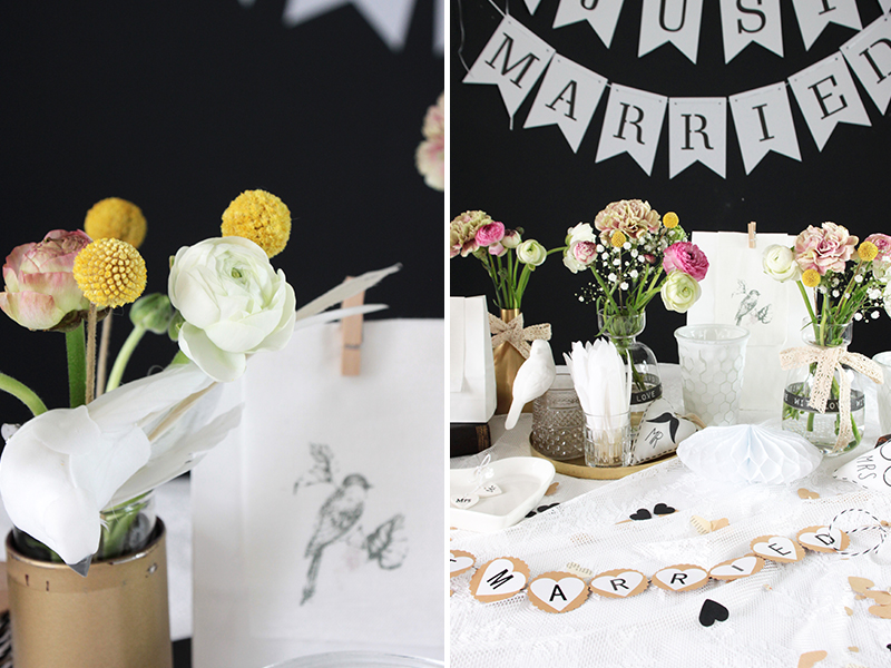 Weitere I-Tüpfelchen sind kleine Dekotauben, weiße Federn und eine Ruck-Zuck DIY Wimpelkette mit dem Schriftzug „Just Married“.