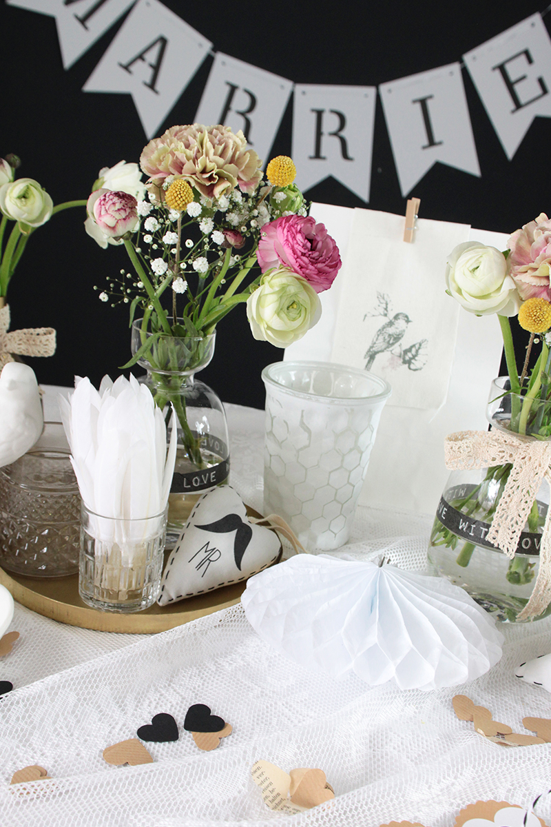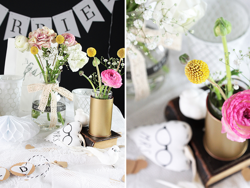Bei meiner Hochzeit vor 3 Jahren haben ich und meine Freundinnen sogar ein richtiges Bastel-Event veranstaltet. Alle kamen an einem sonnigen Tag zusammen und haben den ganzen Tag auf unserer Terrasse gebastelt – eine machte alle Stempelsachen, die nächste verschönerte Vasen mit Bändern und Washi-Tape und die andere stanzte Herzkonfetti was das Zeug hält.