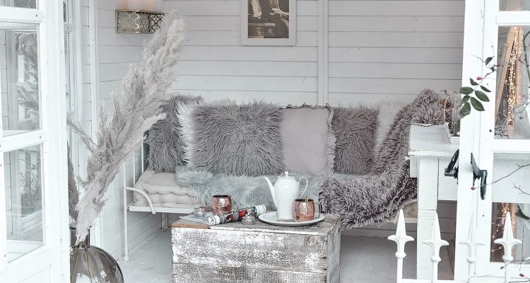 Auch im Winter sitze ich immer wieder sehr gerne hier in meinem kleinen Gartenhaus. Dabei genieße ich die Stille und den Blick in den winterlichen Garten bei einer heißen Tasse Kaffee. Gebettet auf kuscheligen Fellen und Kissen sitzt es sich auch an kühlen Wintertagen gemütlich und warm. Natürlich darf auch die passende Winterdeko auf keinen Fall fehlen. Während ich in den warmen Monaten eher pastellige Farben verwende, setze ich im Winter gerne auf warme Naturtöne. Denn Sie strahlen Harmonie und Ruhe aus.