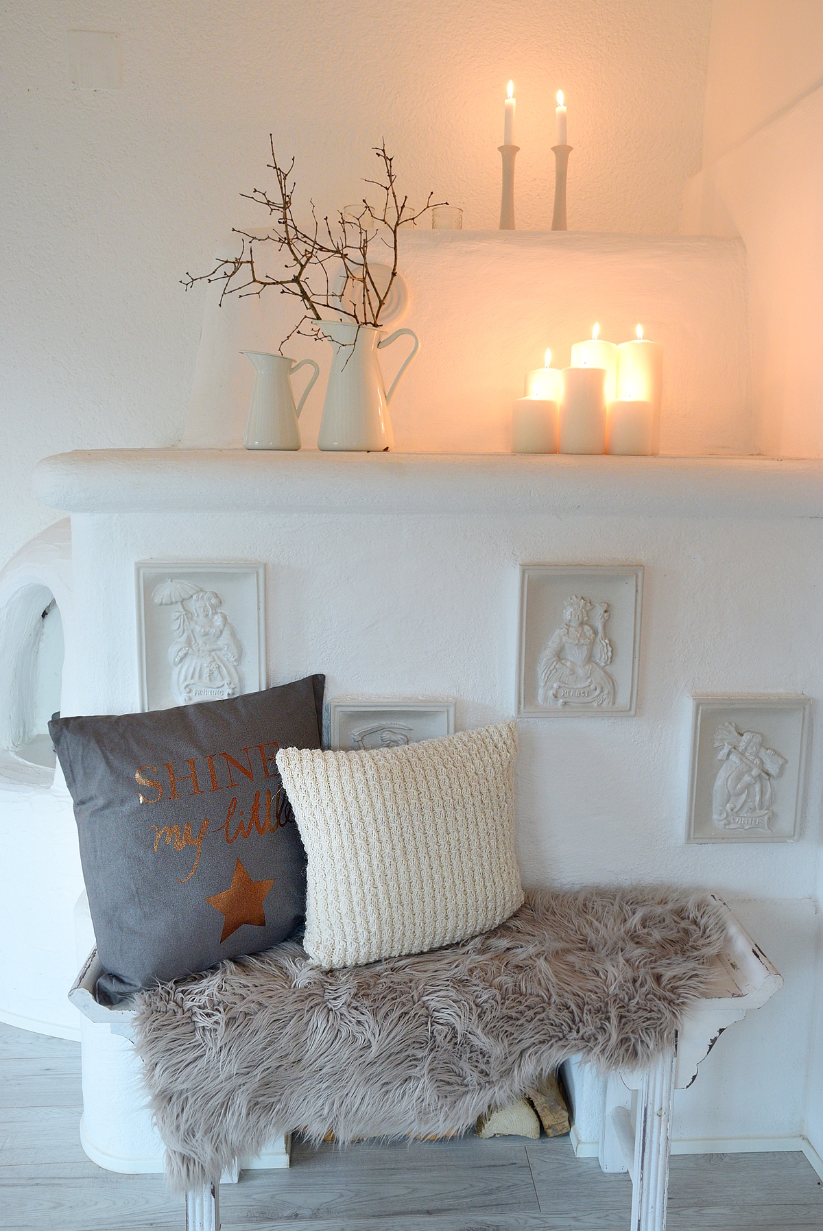 Ein besonders kuscheliges und warmes Plätzchen ist diese kleine Holzbank am Kachelofen. Auch hier dürfen Kissen und ein kuscheliges Fell nicht fehlen.Im Winter, wenn das Wetter draußen schlecht ist, wird es auch tagsüber nicht so richtig hell im Wohnzimmer. Da helfen nur jede Menge Kerzen. Ihr sanftes Licht vertreibt jegliche trübe Stimmung und sorgt für eine stimmungsvolle Atmosphäre.