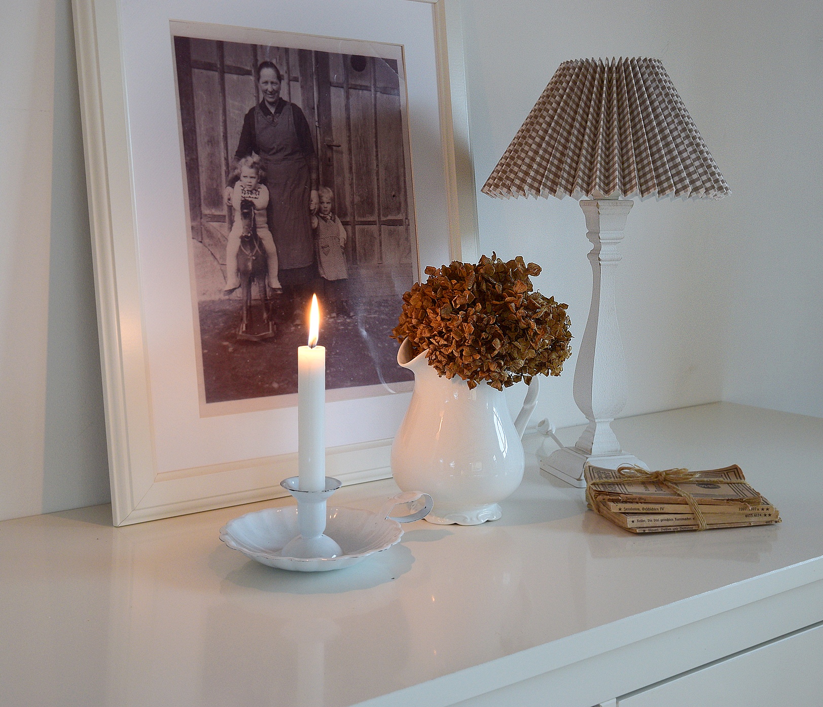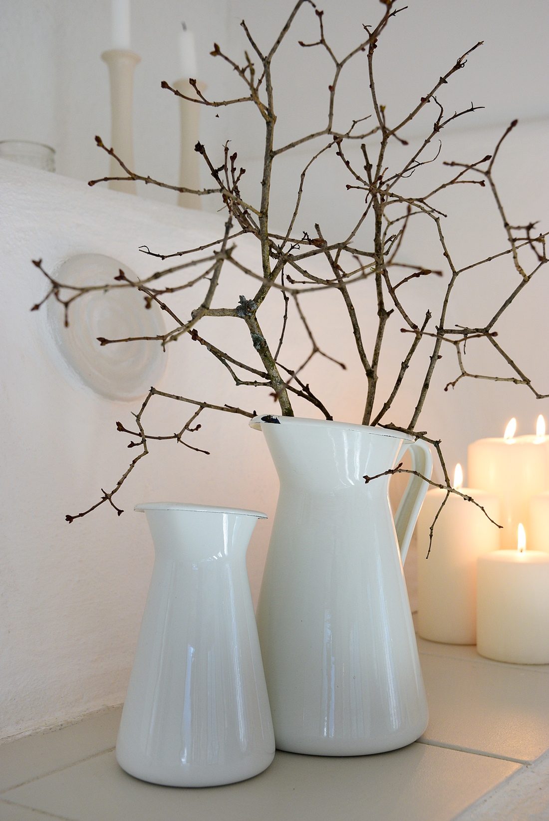 Ich achte stets darauf, dass Natur und Einrichtung farblich im Einklang sind. So verwende ich im Winter auch keine bunten Blumensträuße, sondern lediglich schlichte Zweige, die ich im Garten oder Wald finde. Diese Zweige stammen von unserem Fliederbusch im Garten.