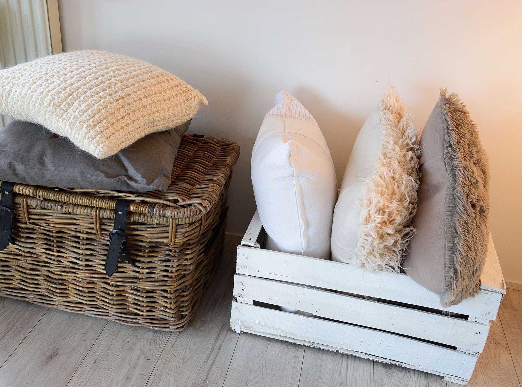 Einige der Kissen finden in dieser alten Holzkiste ihren Platz. Das ist nicht nur sehr praktisch, da die Kissen stets griffbereit sind, sondern auch sehr dekorativ.