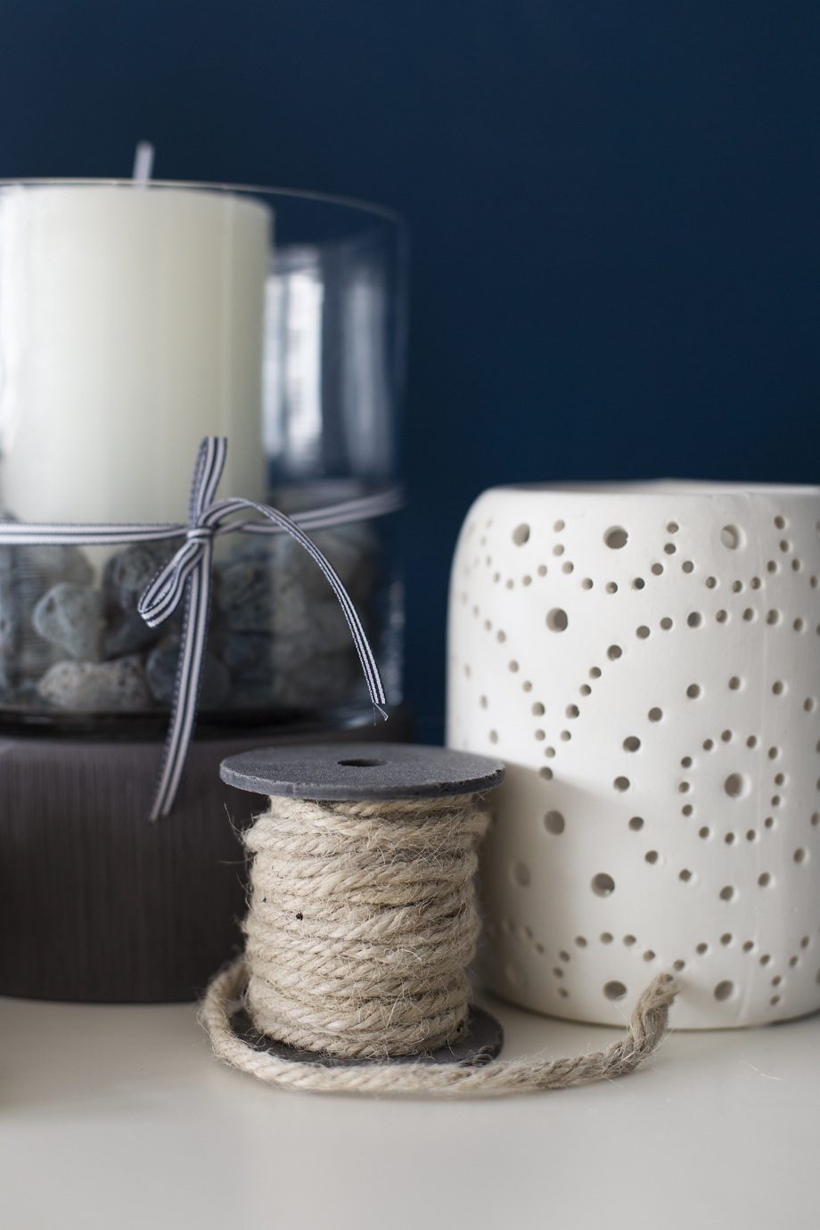Für das erste Arrangement verwendet ich ein Windlicht aus Glas, welches ich mit einer großen, weißen Blockkerze und Bims Steinen in Blau gefüllt hab. Ein darum gebundenes maritimes Dekoband als i-Tüpfelchen gibt dem Windlicht ein schönes Finish. Davor arrangierte ich eine große Muschel sowie eine Spule mit einer Seemannskordel. Ein weißes Windlicht sowie eine zusätzliche weiße Stumpenkerze lockert die sonst eher dunklen Dekoobjekte farblich auf. Um das Arrangement interessant wirken zu lassen, achtete ich darauf mit verschiedenen Höhen zu spielen. Komplettiert wird die maritime Sommerdeko durch ein Dekoschiff im Hintergrund.