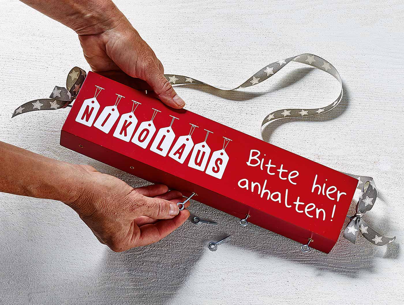 Der Nikolaus ist für die Kinder ein ganz besonderes Ereignis. Damit er ihnen eine schöne Überraschung bringt, geben sich die Kinder das ganze Jahr Mühe artig zu sein. Eine Rute möchte kein Kind in seinem Stiefelchen haben. Das muss natürlich belohnt werden. Damit der Nikolaus die Haustür nicht verpasst, haben wir den passenden Blickfang für Euch. Das Holzbild „NIKOLAUS – Bitte hier anhalten“ kann er überhaupt nicht verfehlen.