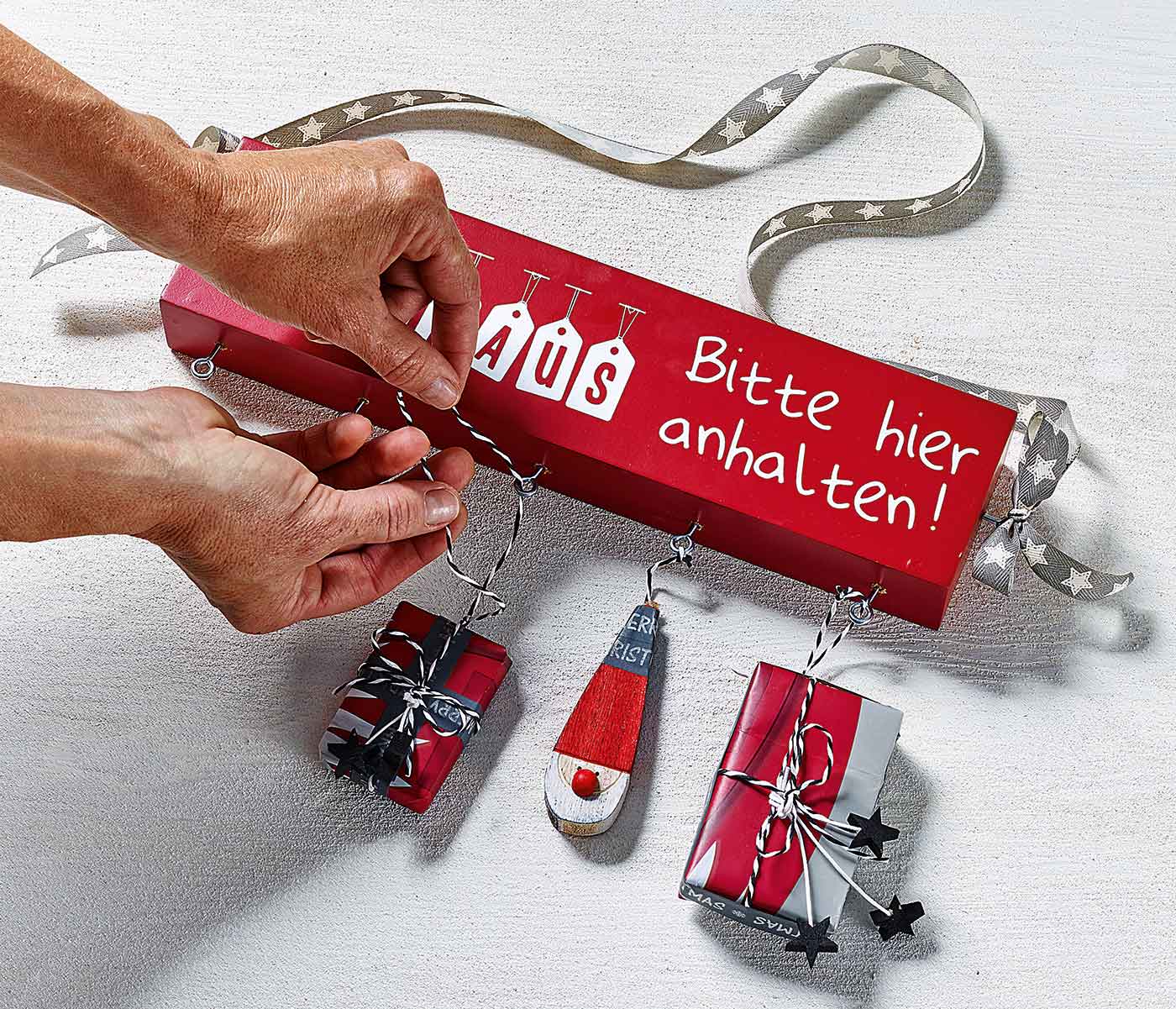 Damit das Bild mit den Stoffbeutelchen und Geschenken nicht so leer hängt, können Sternanhänger oder andere weihnachtliche Anhänger mit einer Kordel oder Geschenkband an die Ösen befestigt werden.