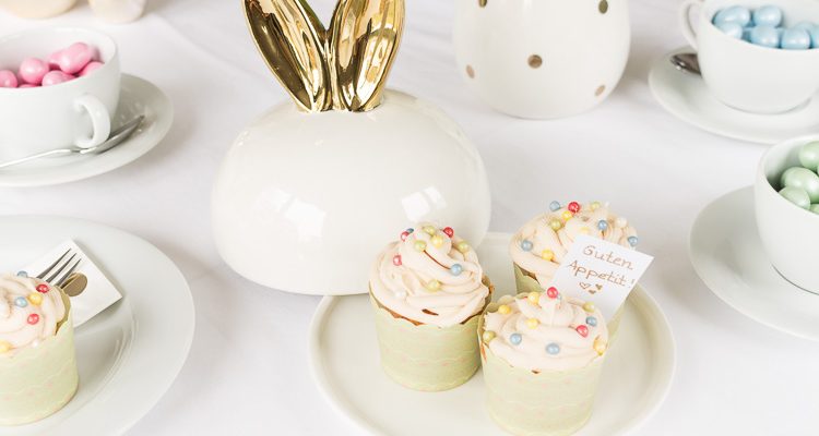 Passend dazu kommen als Tischdeko noch ein paar Porzellan-Eier auf den Tisch, die es in zwei verschiedenen Größen und mit Streifen, Punkten oder ganz in Gold gibt und die mit dem kleinen Deko-Hasen ein perfektes Oster-Trio auf der Kaffeetafel bilden.