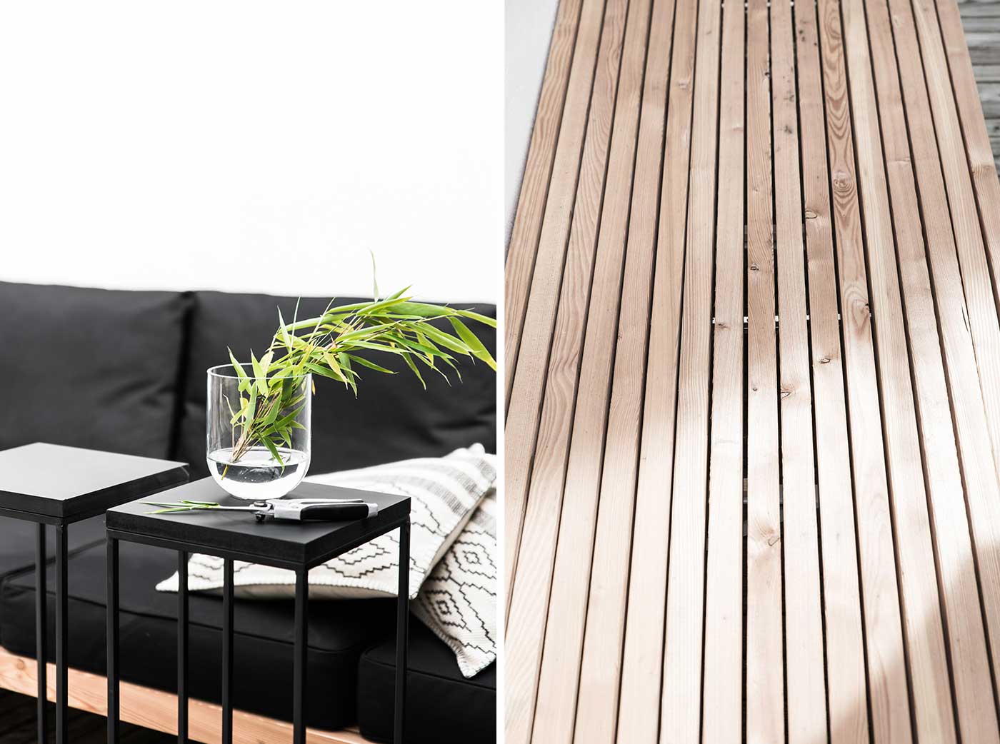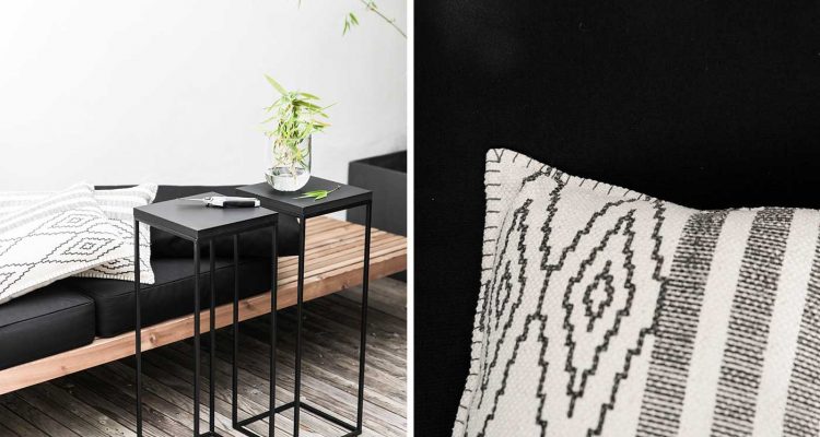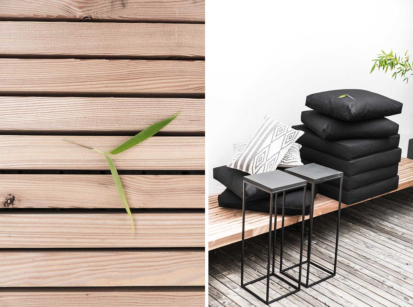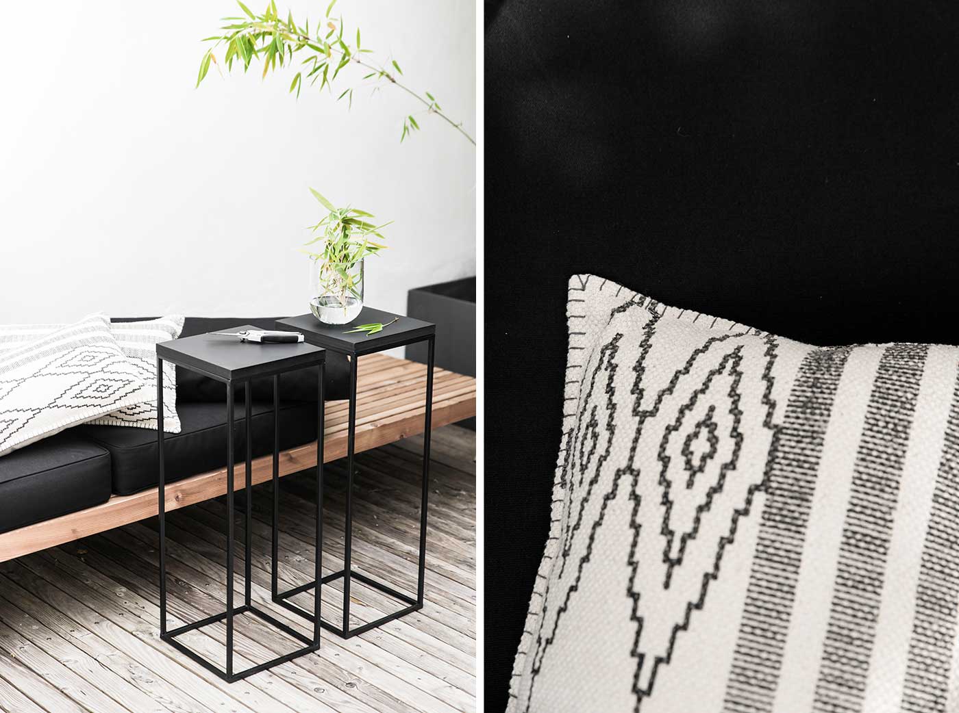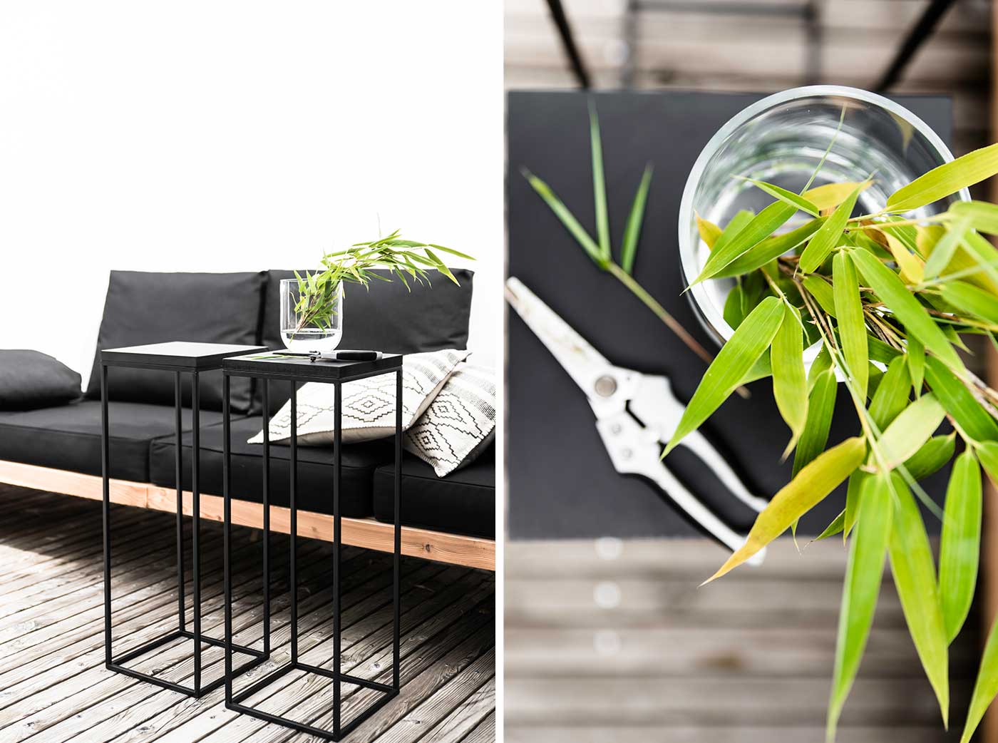 Wenn die Lounge erst einmal steht, darf der Außenraum nach Herzenslust dekoriert werden. Ich setze auf Schwarz. Zusätzliche Kissen von DEPOT, die das Farbthema fortführen, sorgen für Gemütlichkeit. Kleine Beistelltische sind praktische Loungemöbel, die jeweils da aufgestellt werden können, wo am Abend ein Glas Wein getrunken wird. Auch im Outdoorwohnzimmer dürfen zusätzliche Pflanzen oder Blumen nicht fehlen. Ein Bambuszweig macht sich auch hier in der Vase sehr gut, welche ebenfalls als Windlicht verwendet werden kann.
