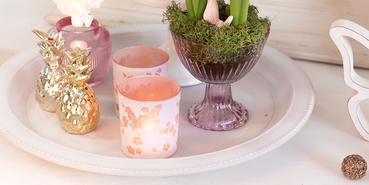 Frisches Grün darf im Frühling natürlich auf keinen Fall fehlen. Hyazinthen und Moos sorgen auf unserem frühlingshaften Dekotablett für eine gewisse Natürlichkeit. Zum Bepflanzen eignen sich Teelichtgläser sowie dieser romantische Kelch aus Glas.