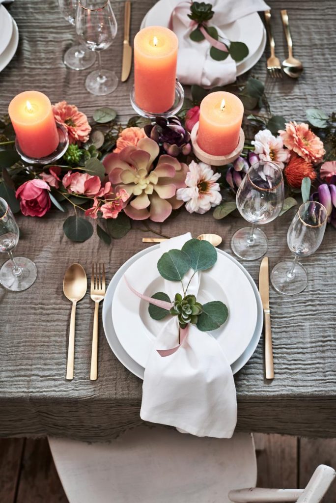 Schaffe mit diesem floralen Look den idealen Rahmen für ein Frühlingsdinner zu Zweit. Schmücke Deinen Tisch mit trendigen Sukkulenten, Kerzen in Pfirsichtönen und goldenem Besteck. Verwende anstatt eines Serviettenrings einfach ein Geschenkband und verziere es mit der Eukalyptusgirlande und einer Agavenblüte.