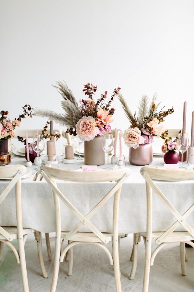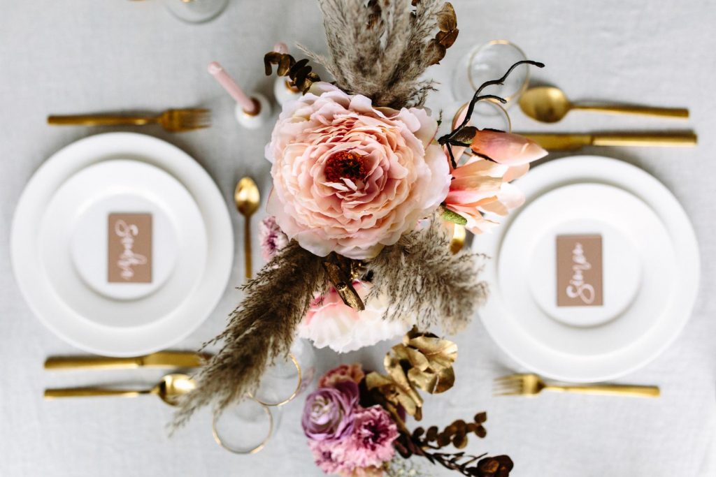 Bei einem romantischen Dinner zu Zweit darf für Dich ein Blumenstrauß nicht fehlen? Dann ist dieser Look genau das Richtige für Dich! Dekoriere Deinen Tisch mit einem opulenten Strauß aus Pampasgras, Pfingstrosen und Magnolien. Die glänzenden Kerzen und stylischen Vasen in Rosé-Nuancen harmonieren perfekt mit dem Besteck in Gold.
