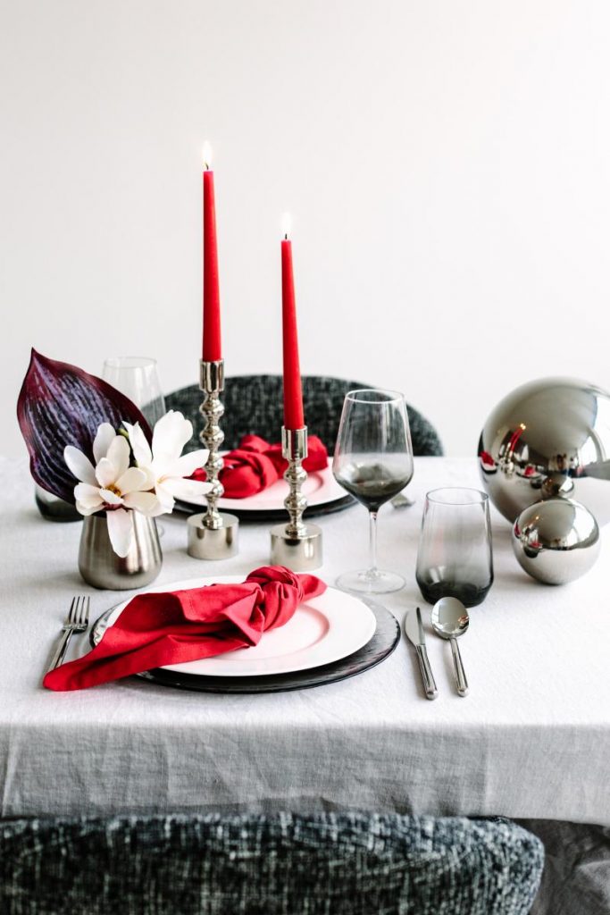 Ein elegantes Ambiente wie im Nobelrestaurant schaffst Du mit diesem Look in der Farbe der Liebe, modern interpretiert mit Silber und Schwarz. Die trendige Magnolie im schicken silbernen Übertopf rundet den Look ab.