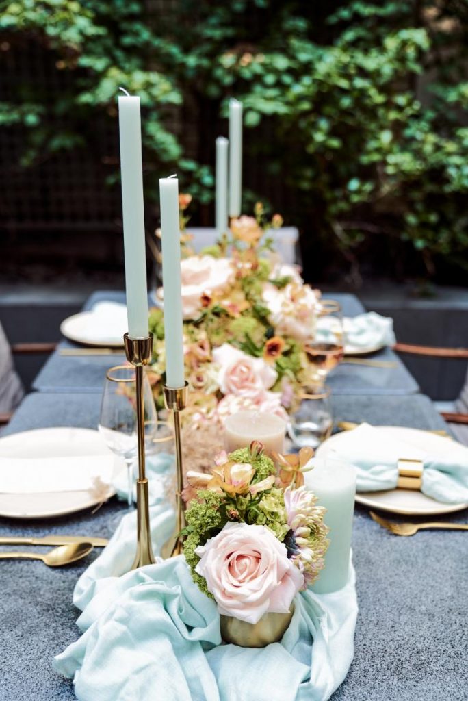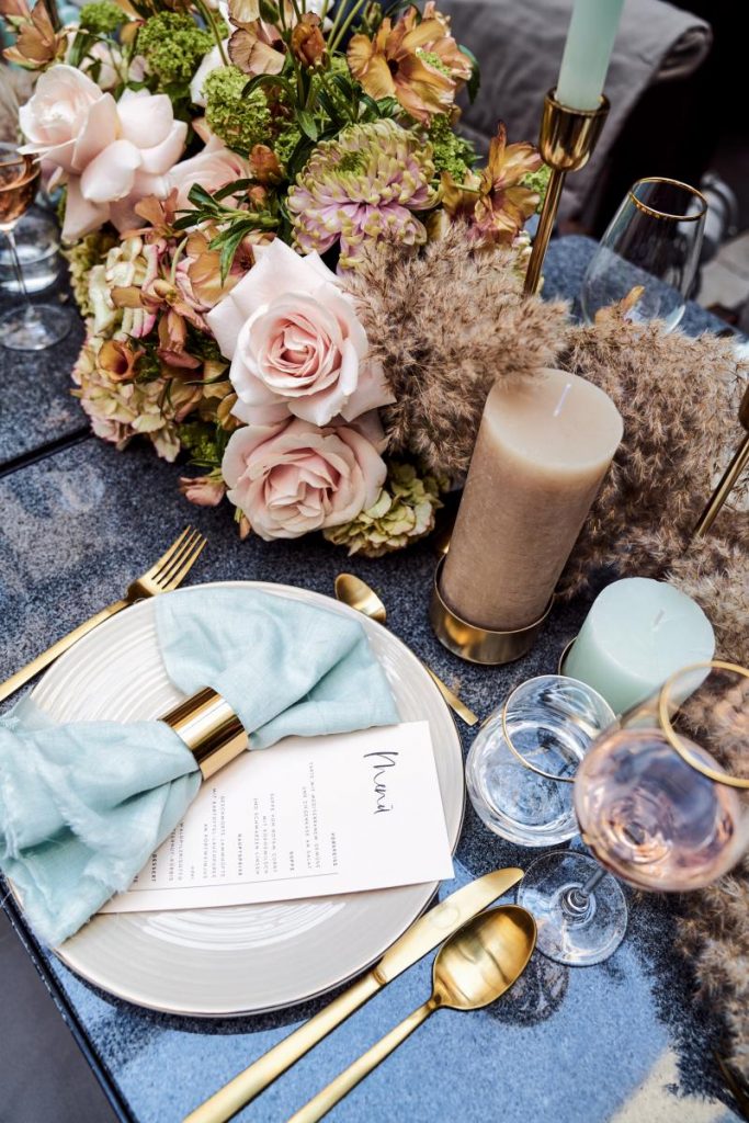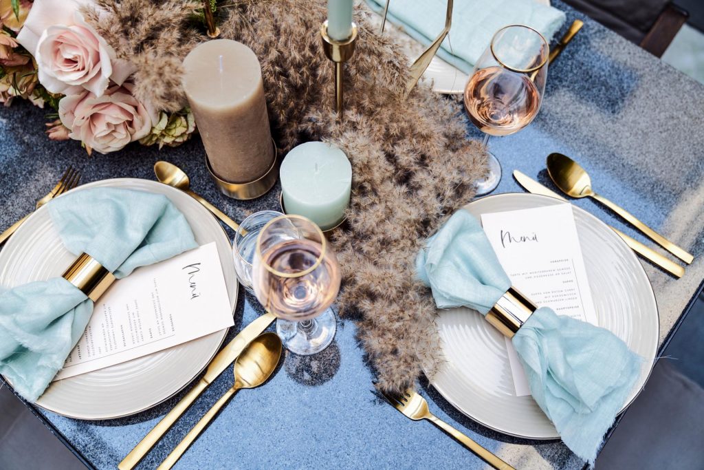Du möchtest keine Tischdeko in lieblichen Rosatönen? Dann verziere Deinen Tisch mit hellem Mint und glänzenden Golddetails. Die Stumpenkerzen sorgen für ein romantisches Ambiente.