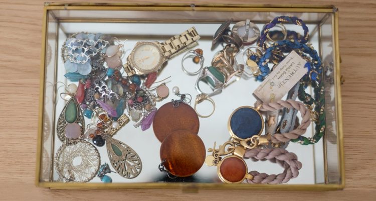 Am Sideboard steht eine gläsernen Schmuckschatulle, in der meine bunten Armbänder , Uhren sowie Ringe und Chandelier Ohrringe untergebracht sind. Jetzt hab ich nicht nur ein optisches Deko-Highlight auf meinem Sideboard stehen, sondern seh auch sofort welcher Schmuck für welches Outfit am besten passt.