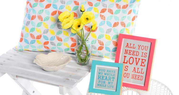 Legt das Kissen auf den Stuhl und stellt die kleinen Rahmen auf einen Beistelltisch o.Ä. Auch die Blumen und die Schale stellt Ihr daneben.