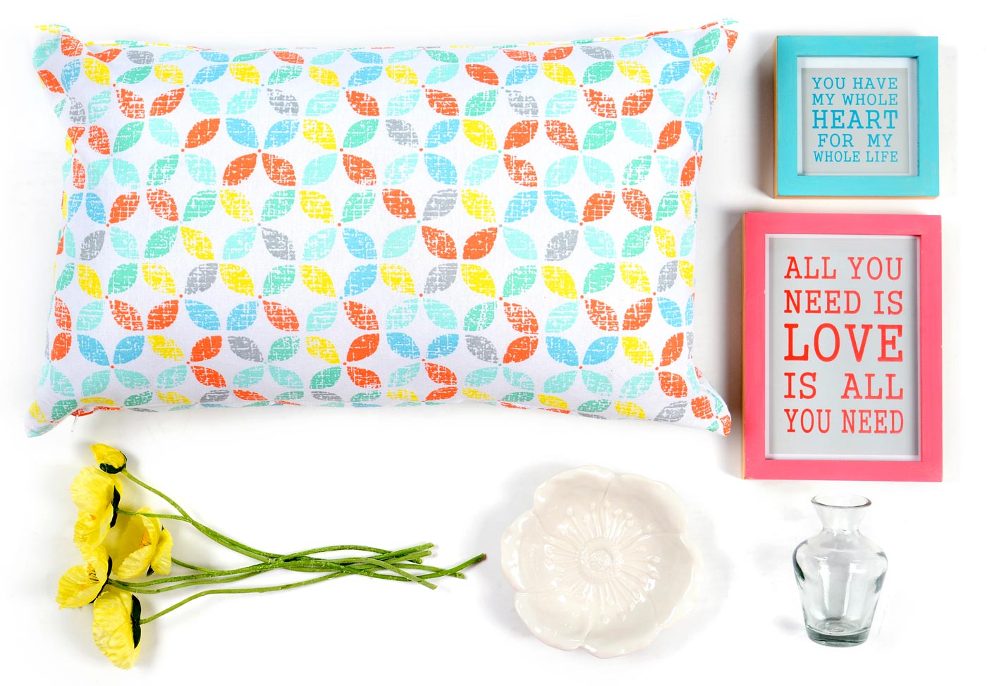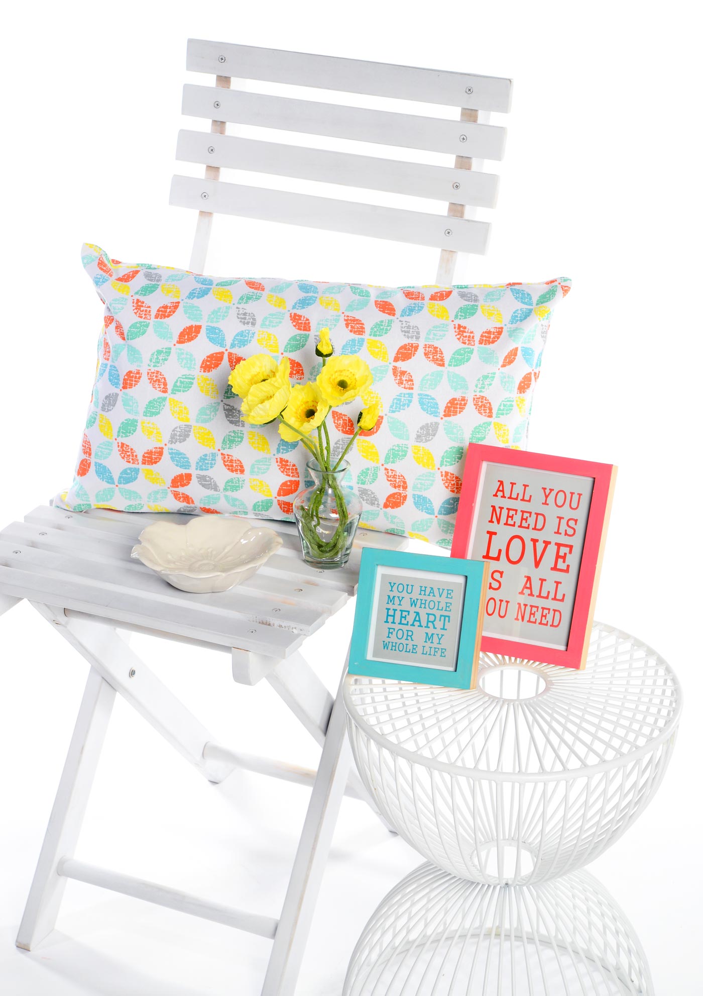 Legt das Kissen auf den Stuhl und stellt die kleinen Rahmen auf einen Beistelltisch o.Ä. Auch die Blumen und die Schale stellt Ihr daneben.