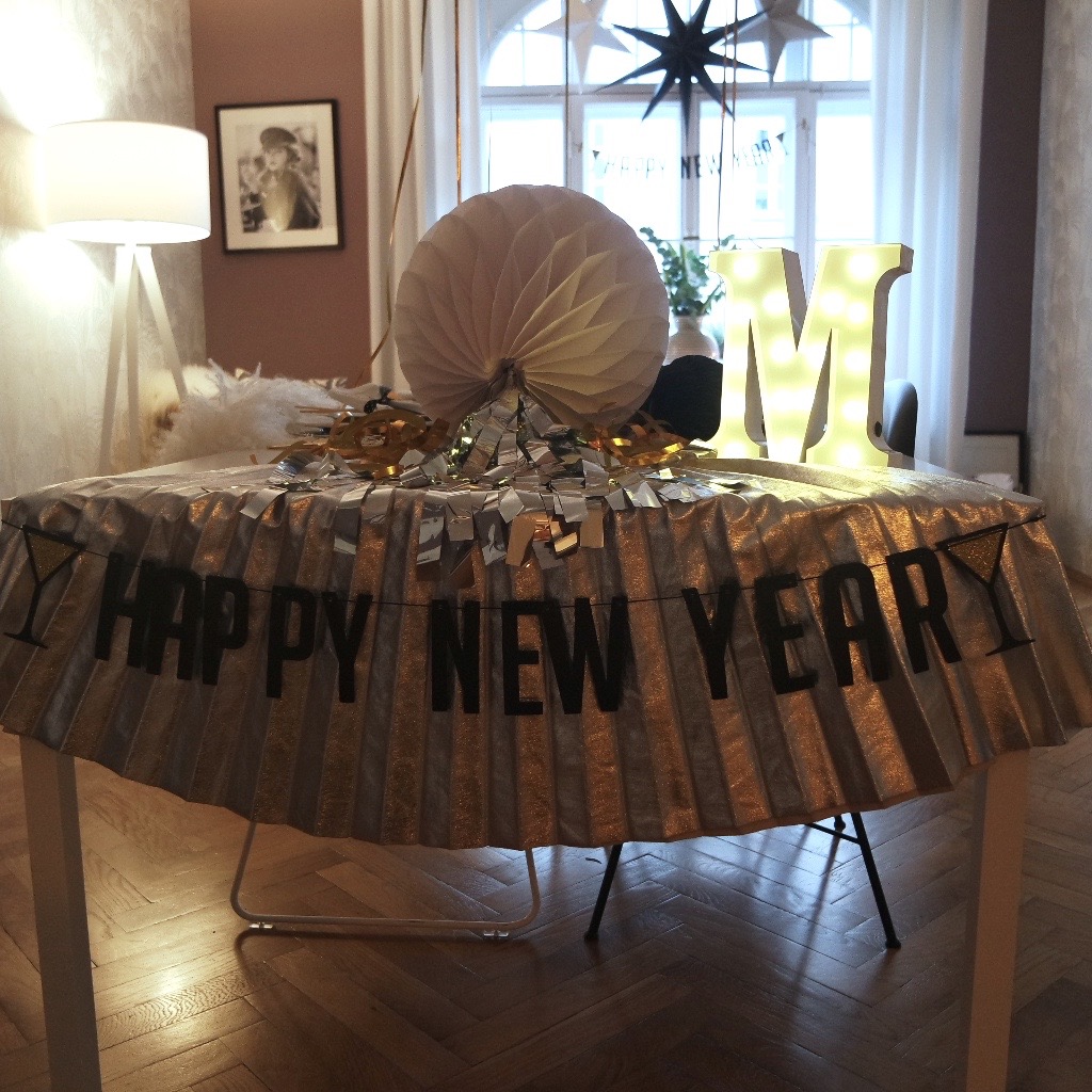 Als ich den Tisch für dieses Tablesetting vorbereitet habe, kam ich gerade aus der Stadt und hatte vergeblich nach Glitzerstoff als Tischdecke gesucht. Kurzerhand habe ich dann meinen silbernen Plisseerock aus dem Kleiderschrank genommen und zweckentfremdet. Wenn Ihr also das gleiche Problem habt, stöbert mal in Eurem Schrank. Vielleicht lässt sich da das ein oder andere funkelnde Stück finden, dass man mit viel Luftschlangen & Co. so kaschieren kann, dass man die ursprüngliche Form nicht mehr erkennt. Wenn nicht, die klassische weiße Tischdecke oder Tischsets.