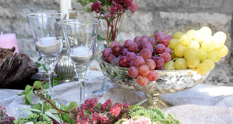 Auf einem herbstlich gedeckten Tisch dürfen die Früchte des Herbstes natürlich auf keinen Fall fehlen. Süße Weintrauben leuchten dunkelrot in einer Vintage-Schale aus Bauernsilber und erinnern uns an die herrlichen Sonnentage des leider nun zu Ende gehenden Sommers.