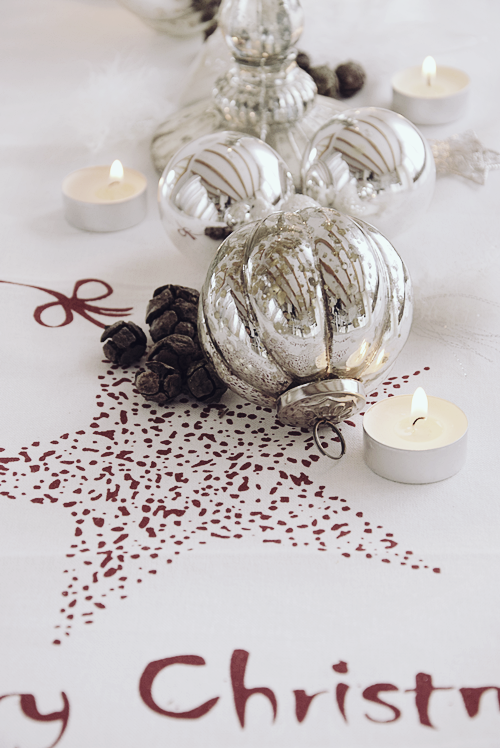 Zur Weihnachtszeit darf auch ein bisschen Glanz nicht fehlen. Bauernsilberne Kerzenständer, silberne und weiße Kugeln zusammen mit silbernen Sternen und kleinen federleichten Engelsflügeln, verzaubern den alltäglichen Küchentisch in eine festliche Tafel. Untermalt wird diese zauberhafte Tischdekoration von diesem hübschen Tischläufer von DEPOT, der dasselbe Motiv wie das Kissen darstellt.