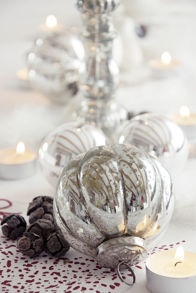 Da in unserem gesamten Haus die Farbe Weiß dominiert, kommen farbliche Akzente, wie diese rote Christbaumkugel und die bauernsilberne Schale, besonders gut zur Geltung. Bauernsilber verwende ich eigentlich das ganze Jahr über. Dieses silbern oder golden schimmernde Glas ist einfach zeitlos und elegant. Fundstücke aus der Natur, wie diese Zypressseenzapfen, finden zu jeder Jahreszeit Platz in meiner Deko. Gerade zur Weihnachtszeit kommen sie besonders schön zur Geltung.
