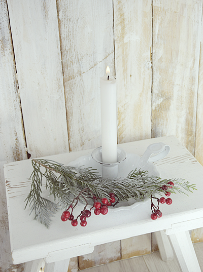 Ein Hauch von Shabby muss es unbedingt sein! Emaille-Gefäße und Kerzenständer verwende ich häufig und gerne. Verziert mit einem grünen Zweig und ein paar roten Beeren versprüht dieser weiße Emaille-Kerzenständer nostalgischen Flair, den ich so sehr mag.