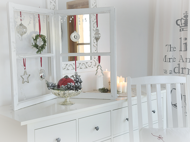 Zwei alte Fensterflügel aus Urgroßvaters Zeiten, die ich ein wenig abgeschliffen und mit weißer Kreidefarbe zu neuem Leben erweckt habe, thronen nun weihnachtlich geschmückt auf unserer Wohnzimmerkommode.