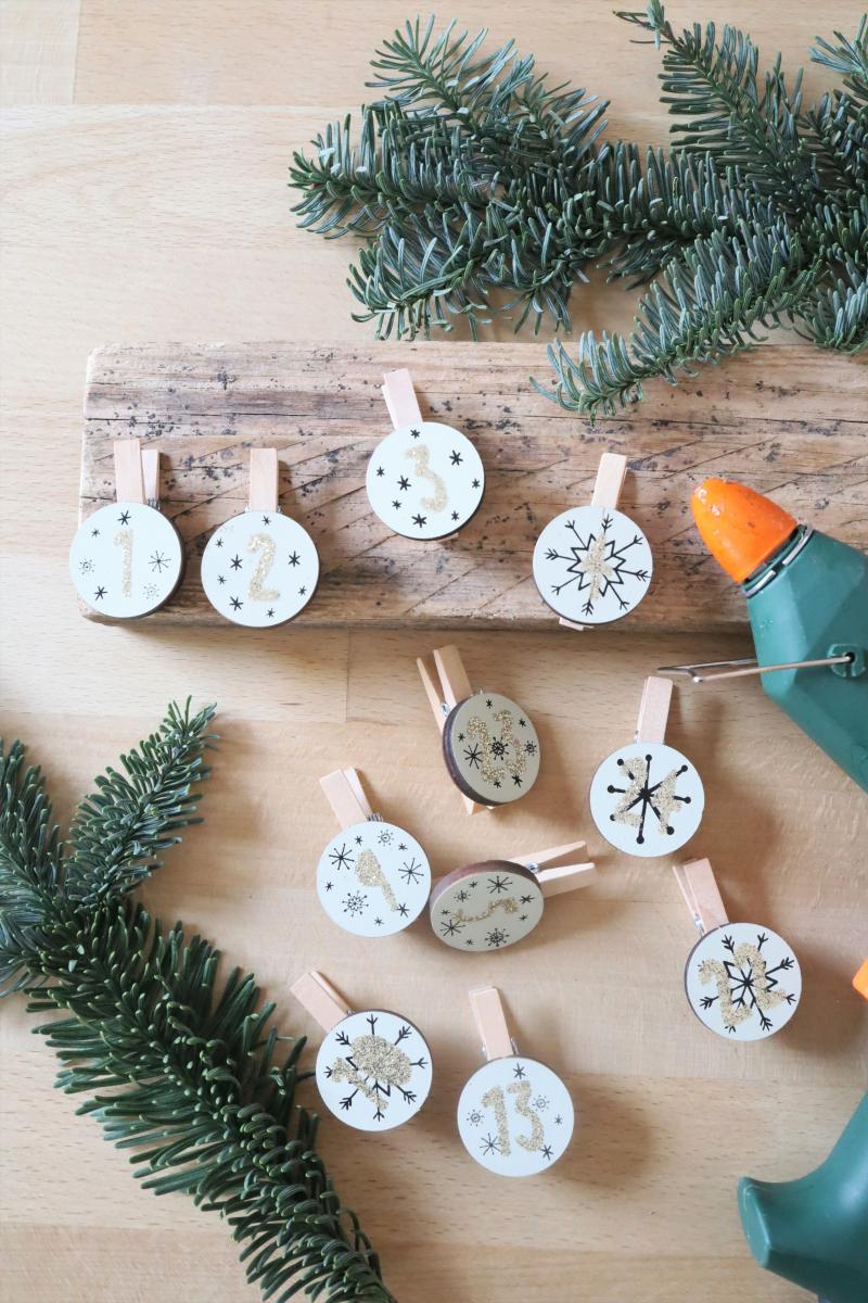 - Die mit Zahlen nummerierten Klammern auf dem Brett verteilen, entweder der Reihe nach von 1-24 oder durcheinander, und mit der Heißklebepistole festkleben.