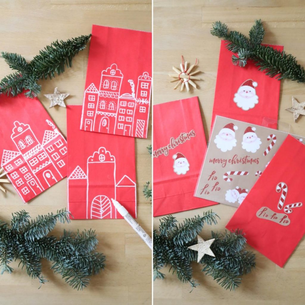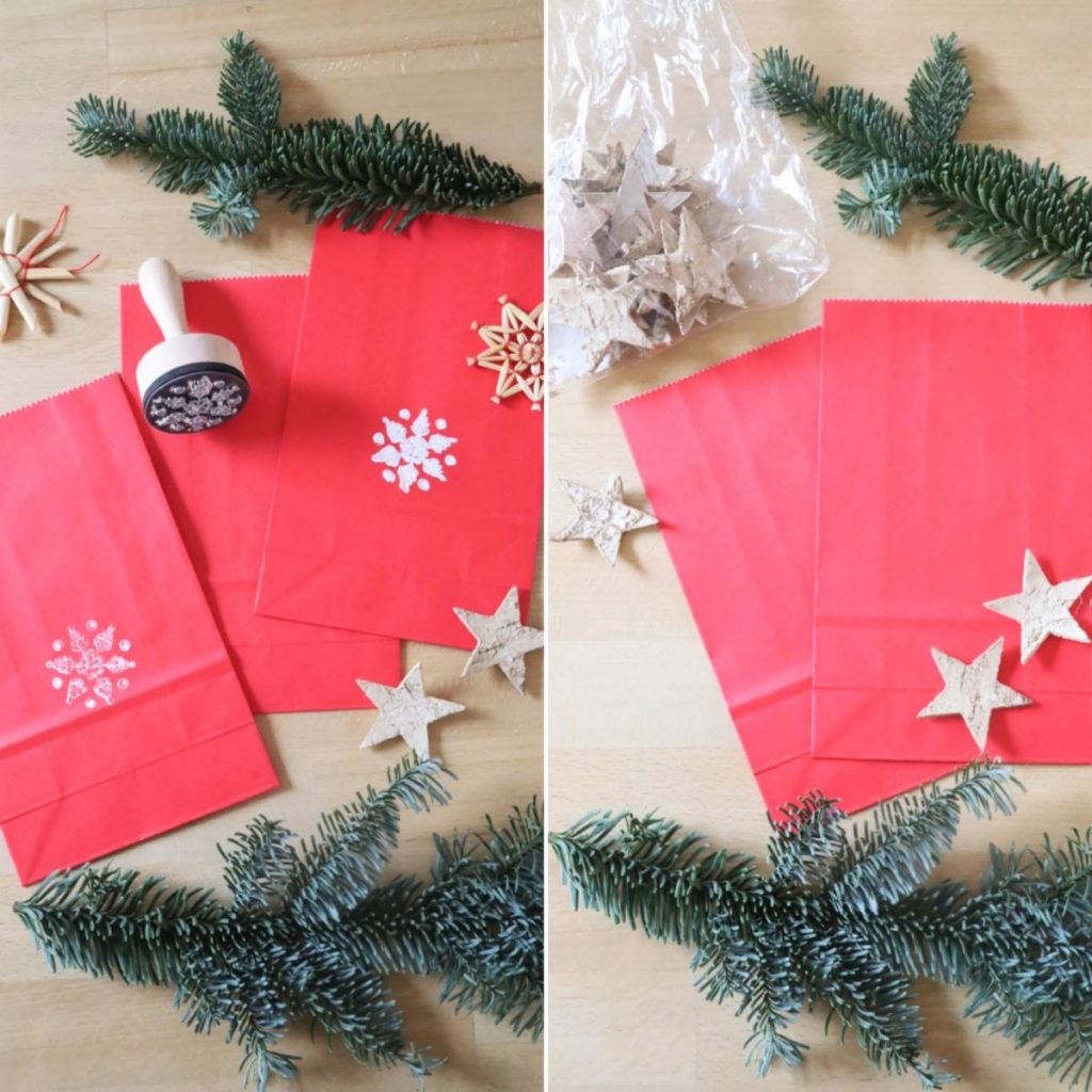 - Die Tüten unterschiedlich verzieren z. B. einen Teil davon mit Weihnachtsstickern bekleben, mit einem Kreidestift Muster oder Häuser aufzeichnen oder mit einem Wintermotiv bestempeln.