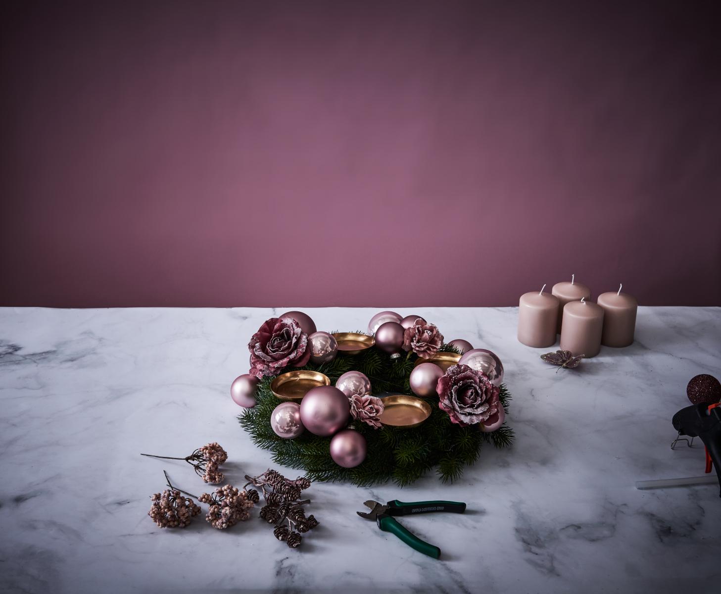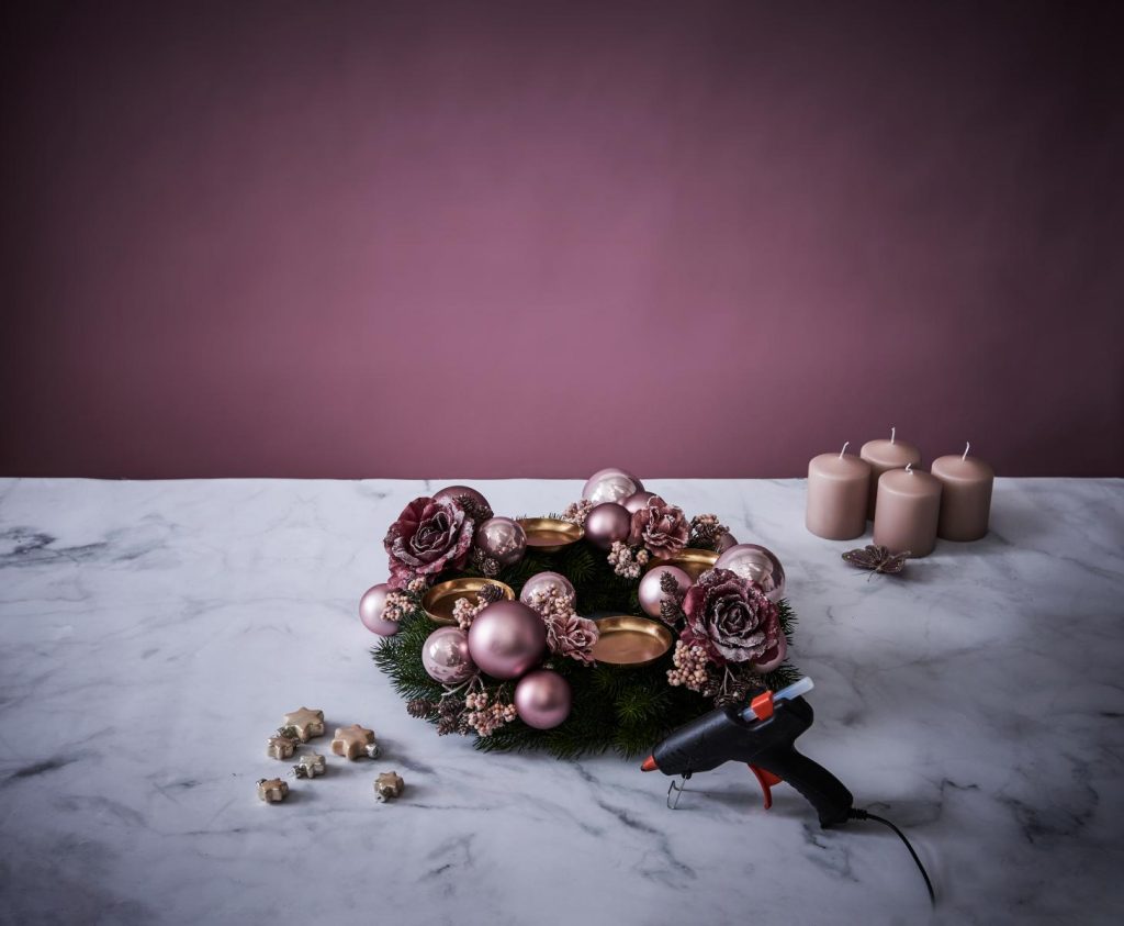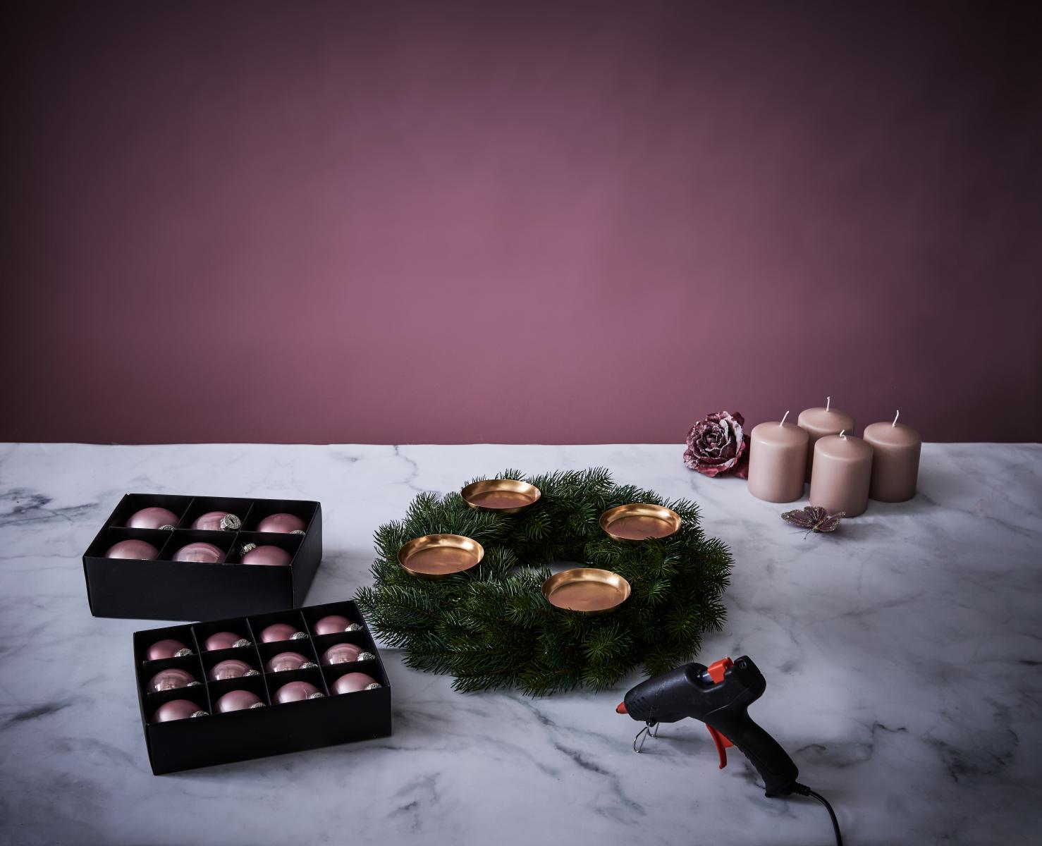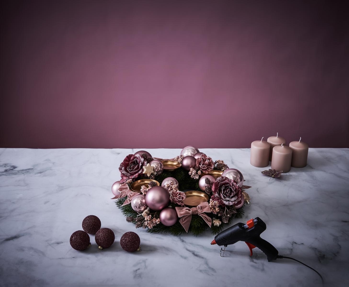 - Nachdem die Tüllen gesteckt wurden, die rosa Kugeln mit einer Heißklebepistrole auf den Kranz kleben.