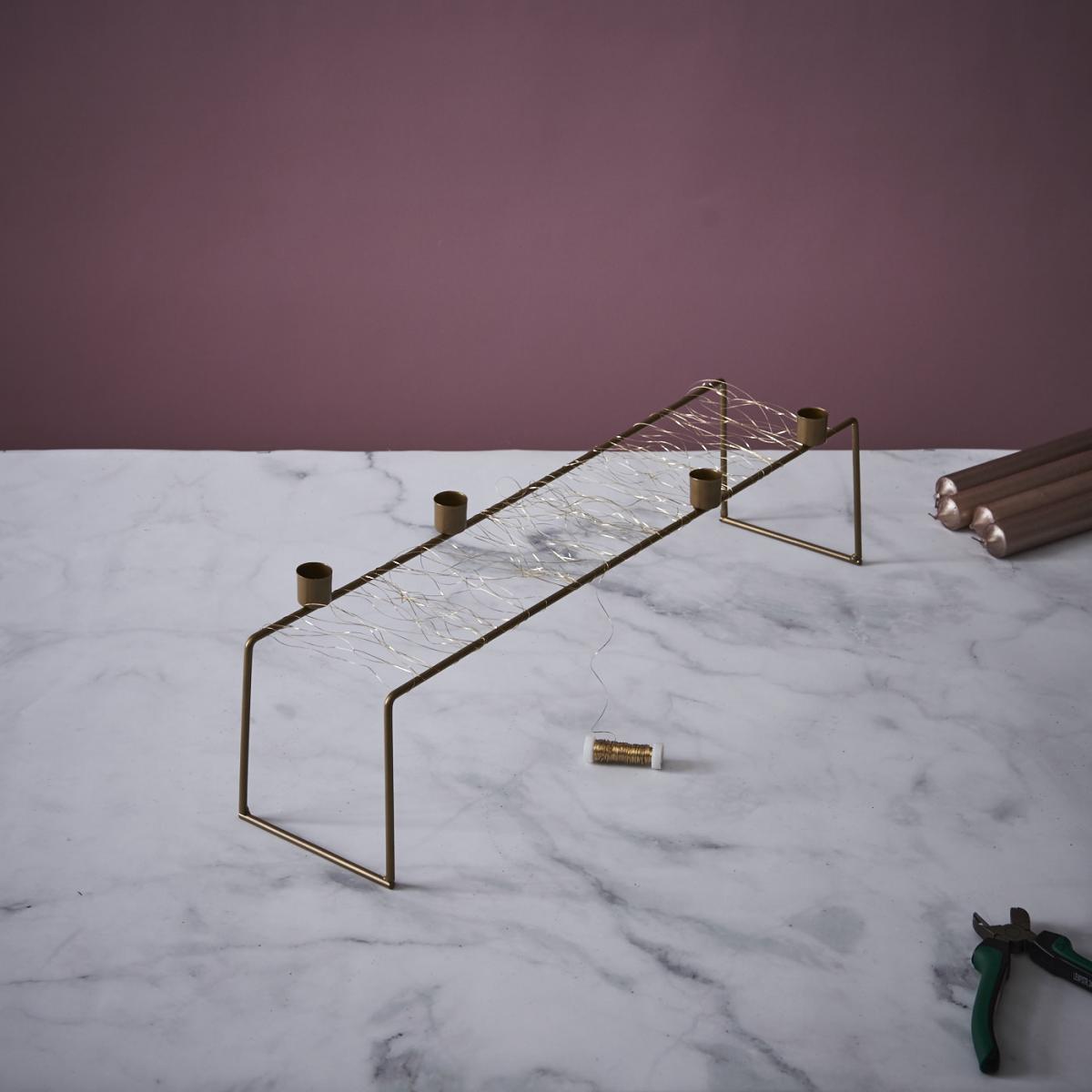 - Den Eukalyptus in kleine Stücke schneiden und mit Golddraht zu einer Girlande wickeln. Hier am besten 10 cm Abstand von Blatt zu Blatt bewahren und sie insgesamt auf 1 m Länge aufziehen. Des Weiteren zur allgemeinen Stabilität 1 m Draht ohne Blätter über die Deko legen.