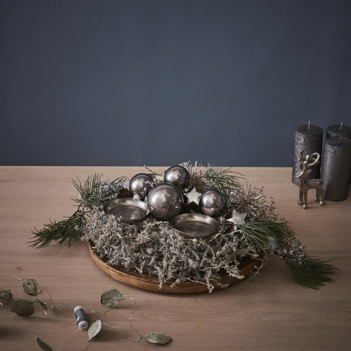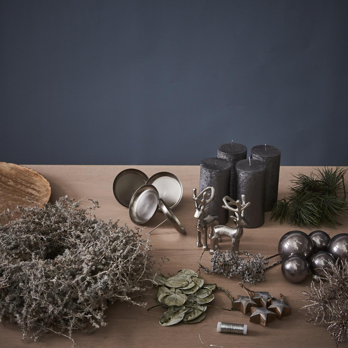 - Für die Eukalyptus-Girlande den Eukalyptus zunächst in kleine Abschnitte zerteilen und die Stiele mit Silberdraht umwickeln. Hier am besten 10 cm Abstand von Blatt zu Blatt halten und sie insgesamt auf 1 m Länge aufziehen. Die Girlande anschließend über den Adventskranz legen.