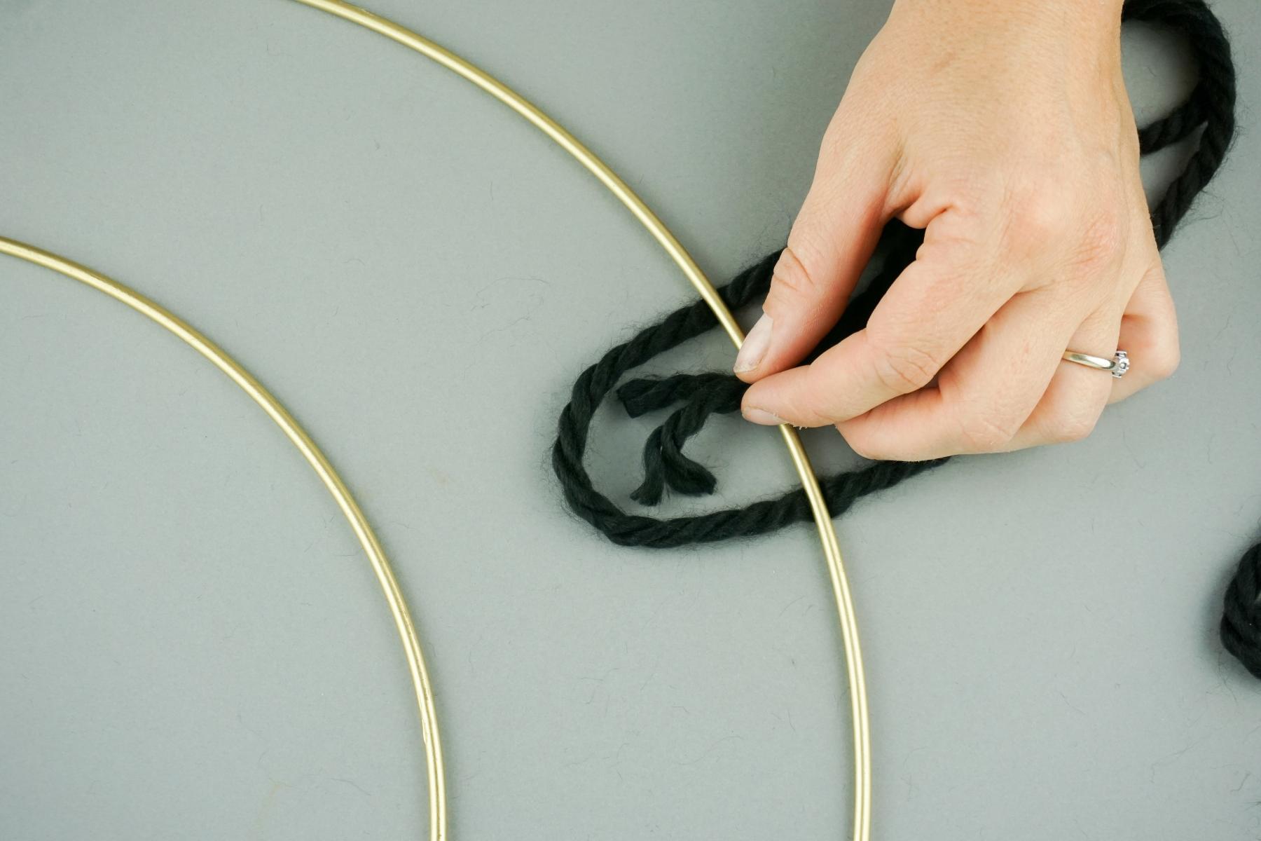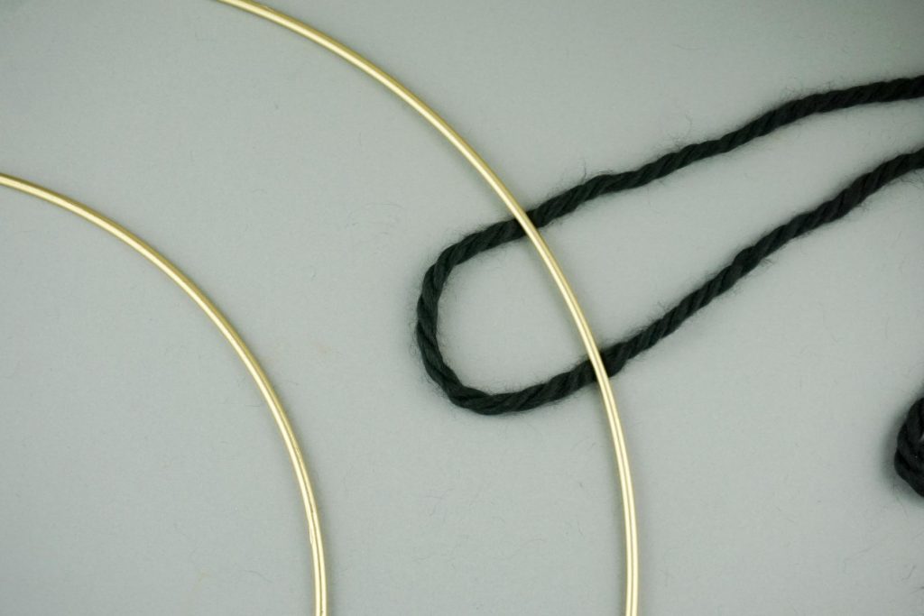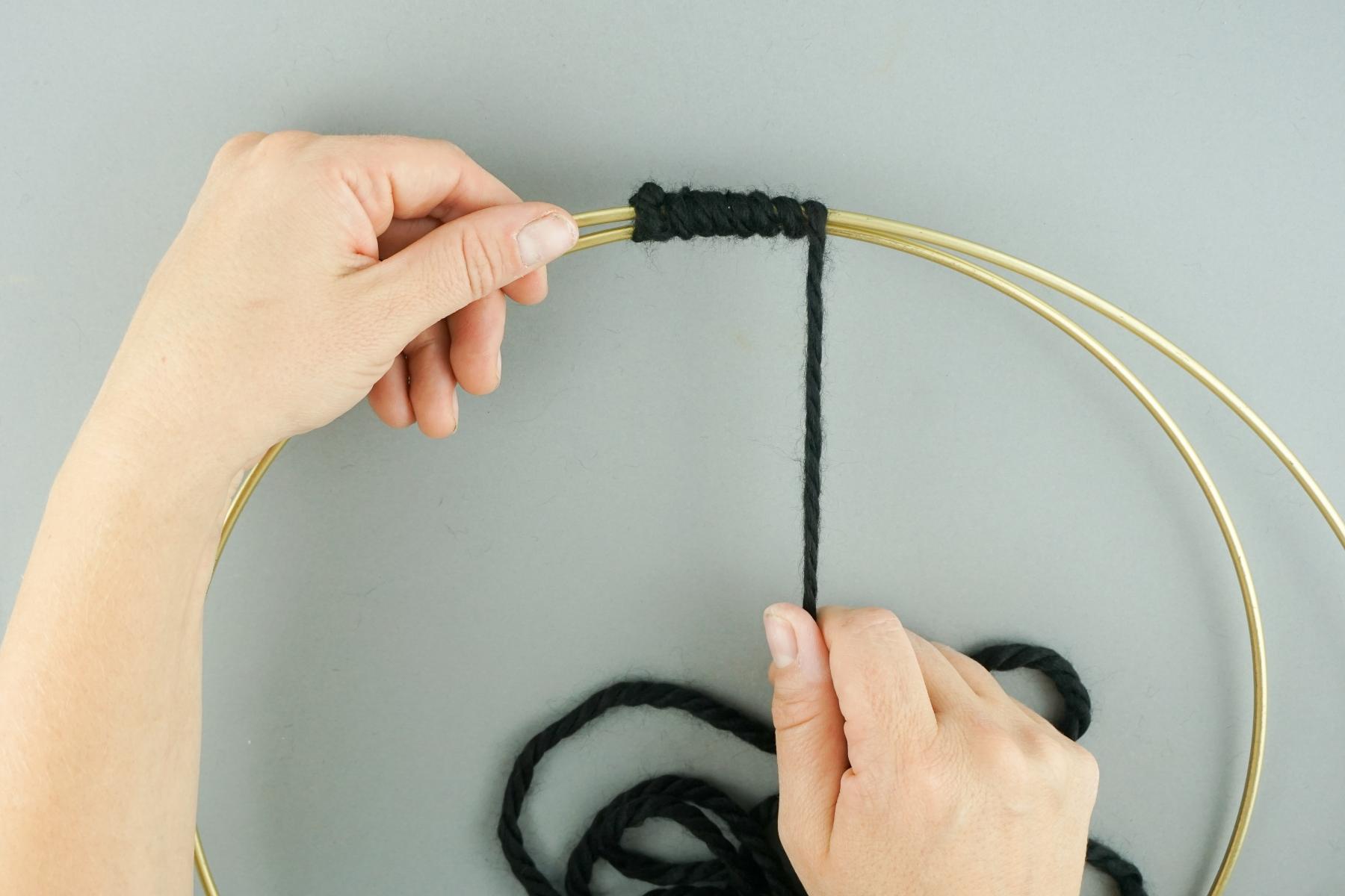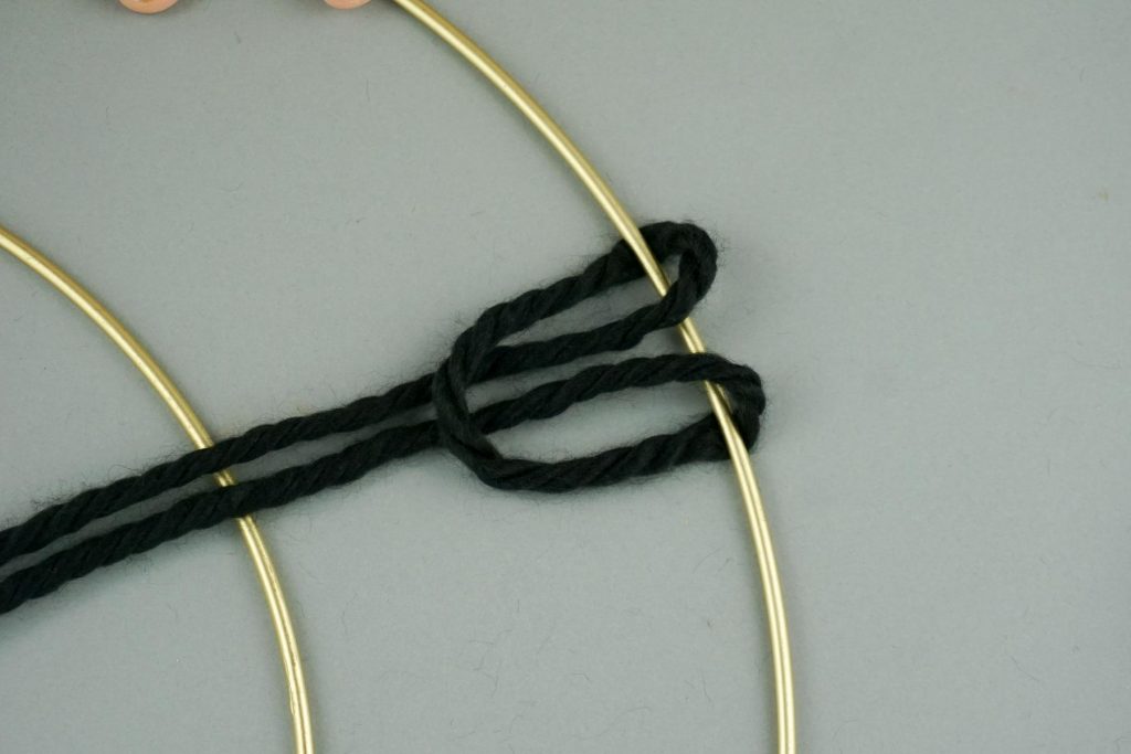 1. Zuerst legen wir die beiden unterschiedlich großen Ringe so ineinander, dass sie sich an einer Stelle berühren und verbinden sie mit dem Wollgarn.