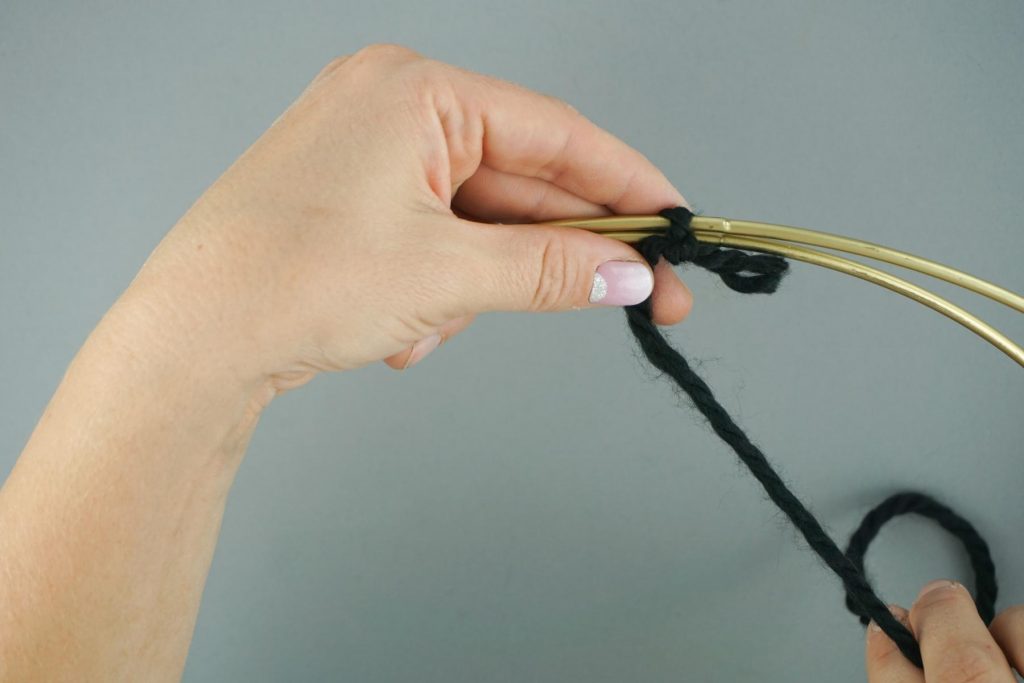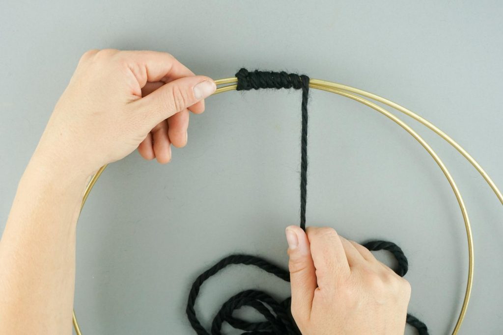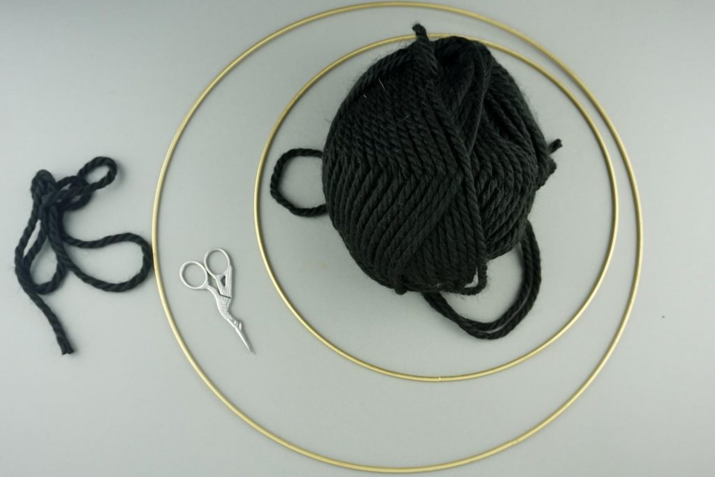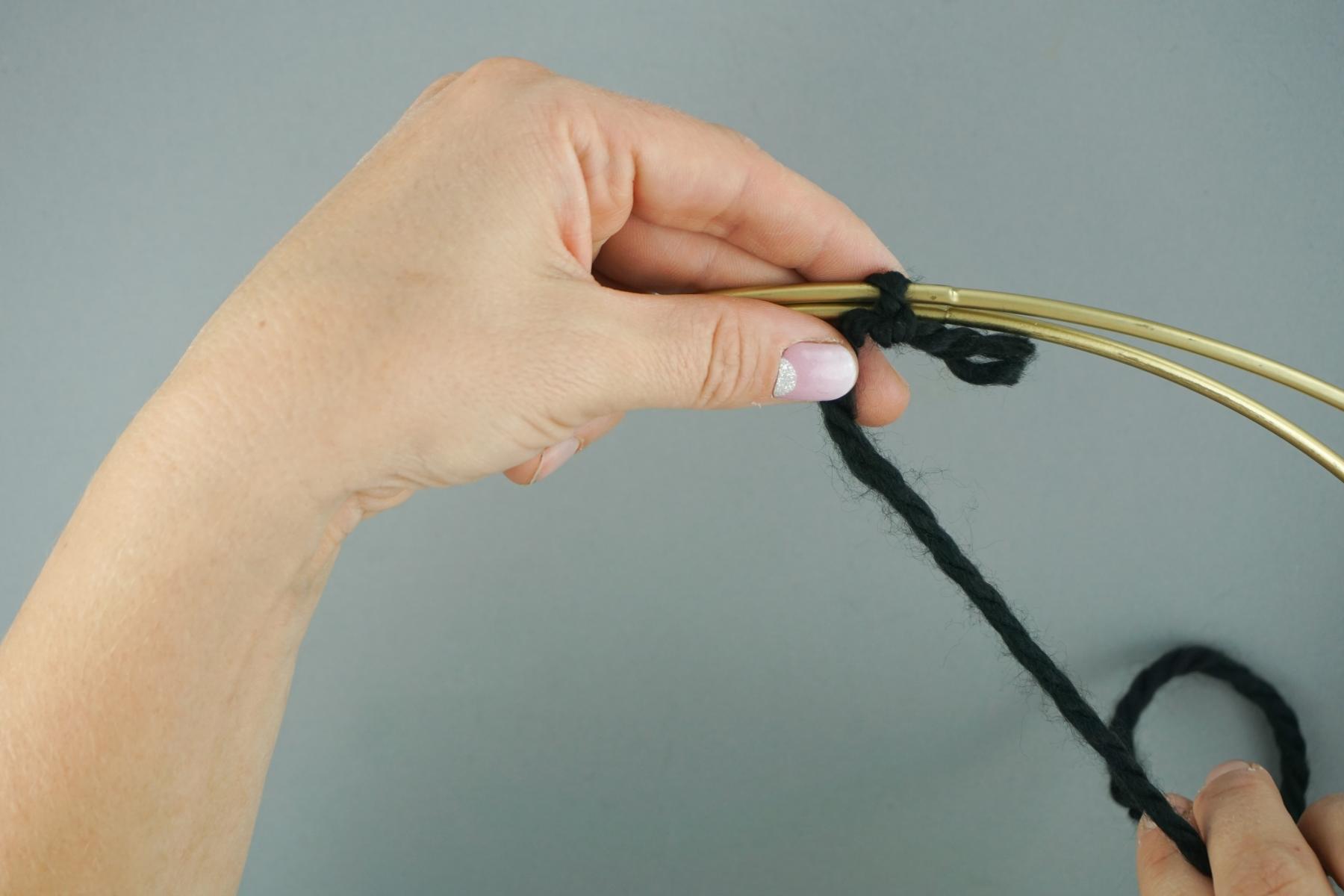 1. Zuerst legen wir die beiden unterschiedlich großen Ringe so ineinander, dass sie sich an einer Stelle berühren und verbinden sie mit dem Wollgarn.