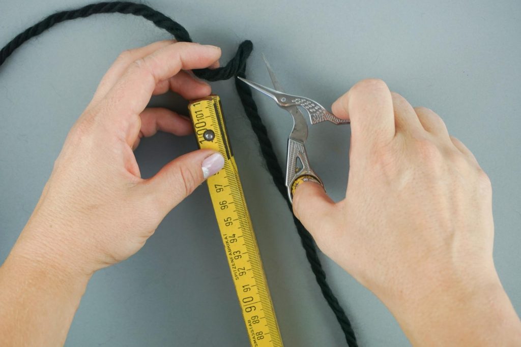 2. Danach schneiden wir ca. 50-60, 1 Meter lange Garnstränge vom Wollgarn ab.