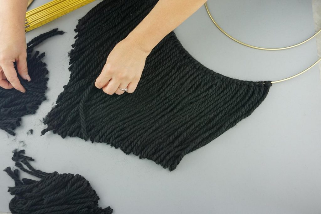 4. Wenn alle Wollgarn am unteren Ringen befestigt sind, schneiden wir diese zu einer Keilform. Dazu habe ich als Hilfe einen Zollstock an die Außenseiten gelegt.