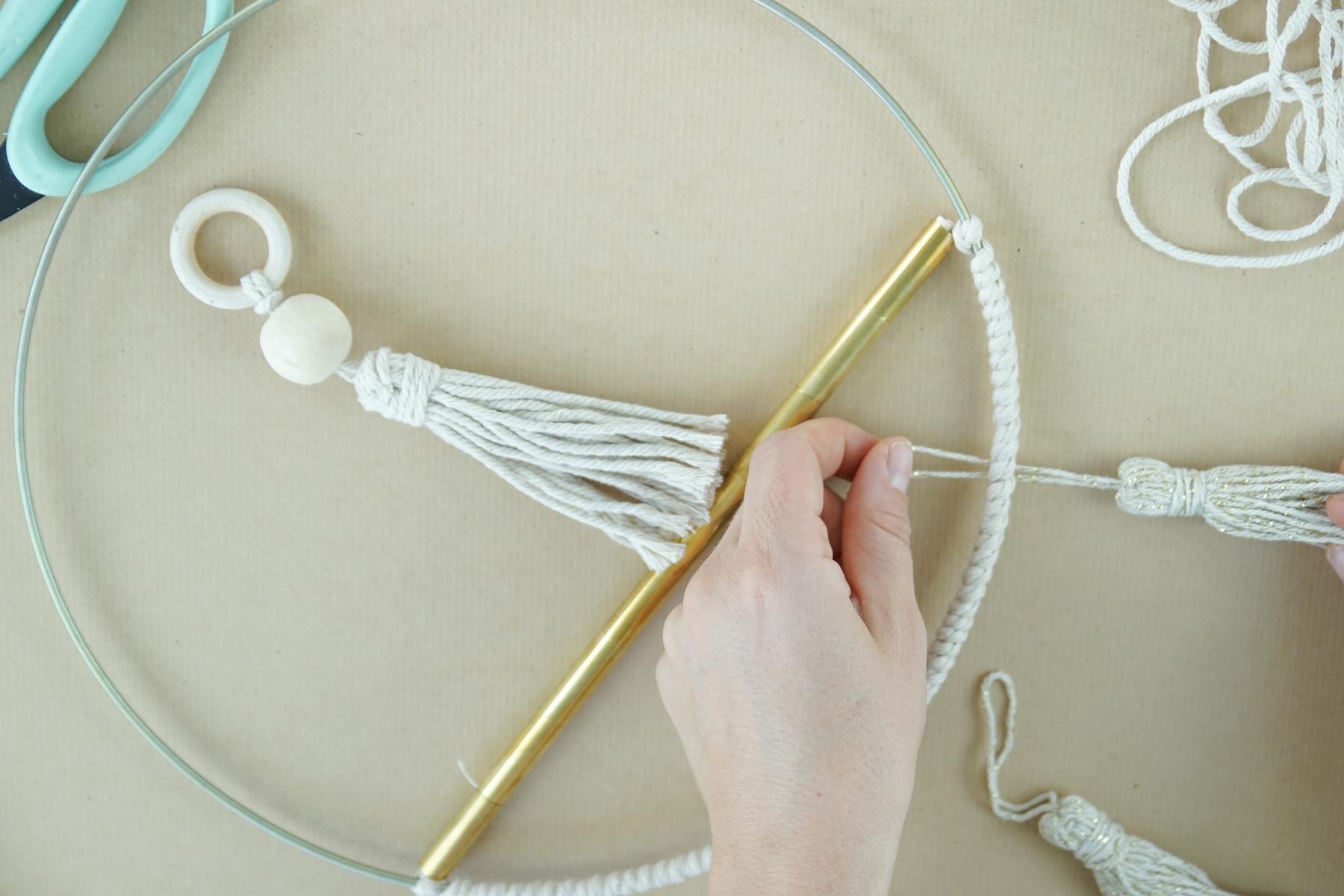 1. Bei der oberen Quaste habe ich mit einem Makrameegarn den Holzring mit dem Metallring verbunden. Und fertig ist der Boho Dekoanhänger passend zu unserer Einrichtung.