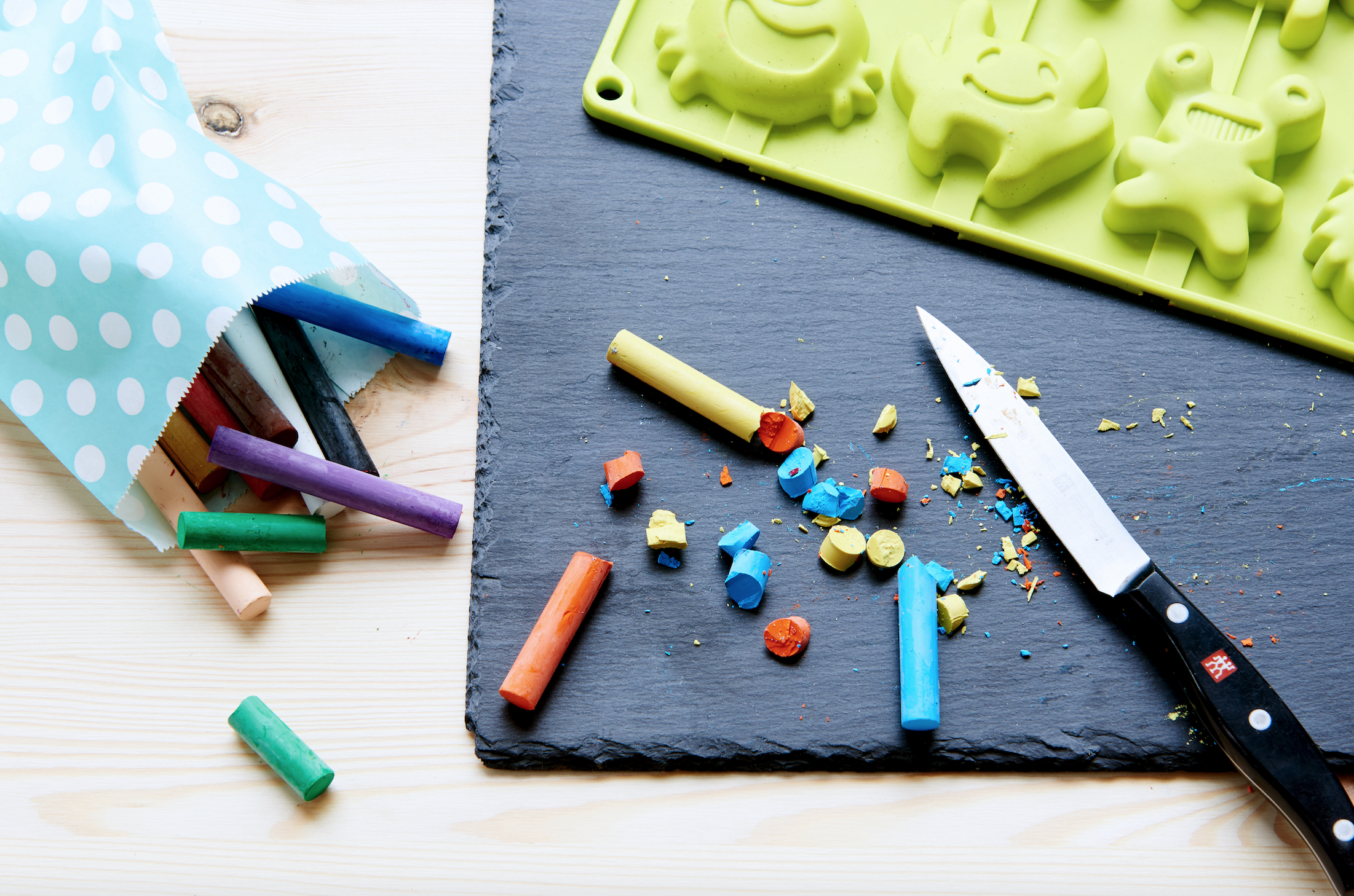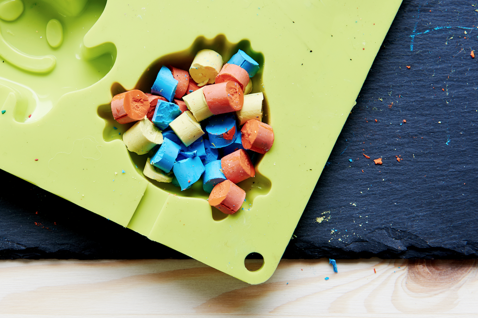 - Such dir alle Reste und Stummel zusammen. Du kannst natürlich auch ganze Wachsmaler nehmen und diese mit einem Messer klein schneiden, je mehr Farben du in die Förmchen gibst desto bunter wird dein neuer Stift später.