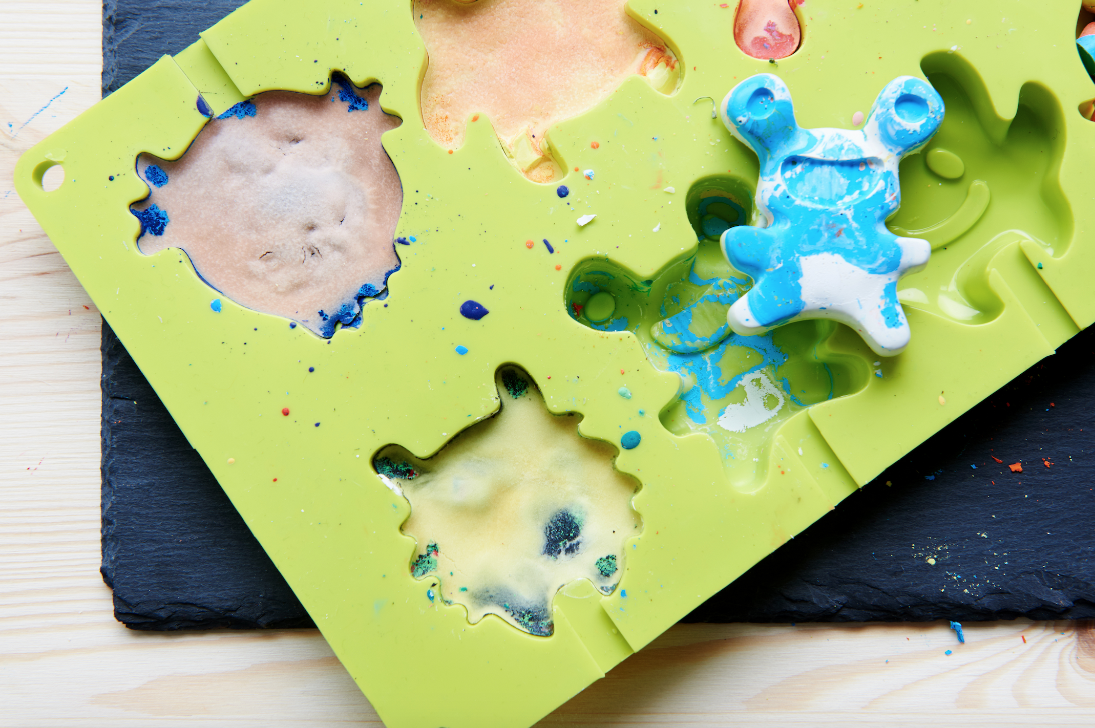 - Nun füllst du die Silikonformen mit den Wachsmalresten und schiebst sie bei 180 Grad für 15 Minuten in den Backofen.