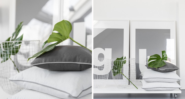 Natürlich habe ich meinen fahrbaren Dekountersatz gleich ausprobiert. An Körben kann ich selten vorbeigehen. Diese sind besonders filigran und tragen nicht so auf. Ich mag Körbe gerne ganz pur als Dekoobjekt. Warum nicht einfach ein Monsterblatt hineingeben. Kissen kann man nie genug haben. Das ein oder andere wandert erst beim „Couchen“ unter den Kopf, derweil machen sie sich als Dekoration auf dem Rollbrett ganz gut. Eine weitere Dekoidee: Auch „Coffee Table Books“ kann man sehr gut auf dem Rollbrett dekorieren.