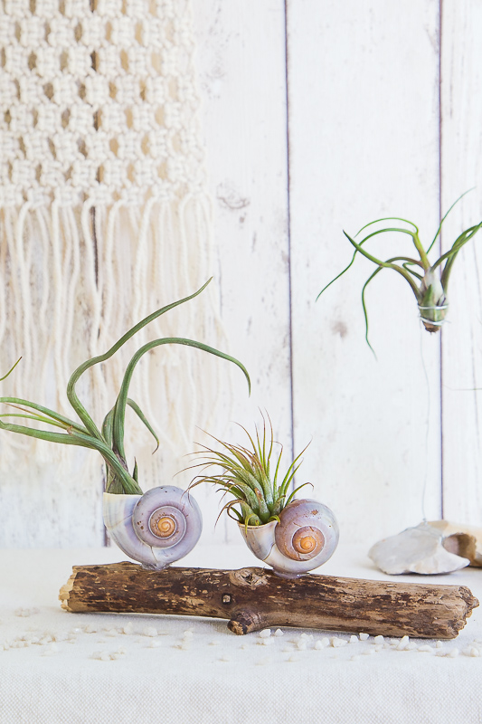Wie ihr gerade gelesen habt, machen sich die Tillandsien besonders gut an, auf und in euren Fundstücken. Diese Pflanzen könnt ihr super in Schneckenhäuser oder Muscheln legen.