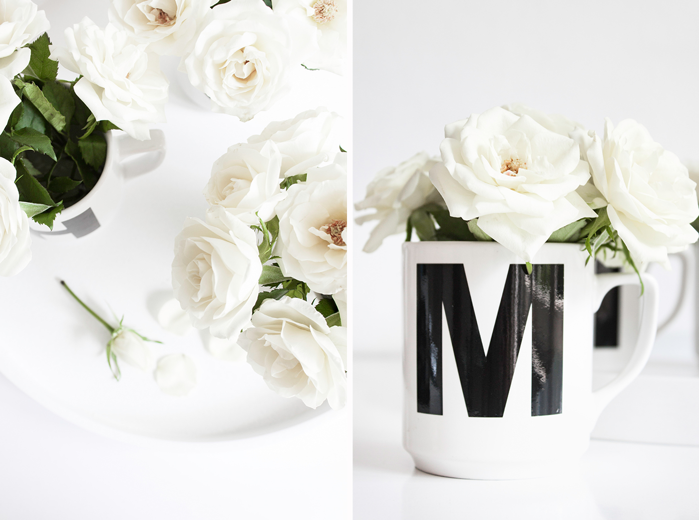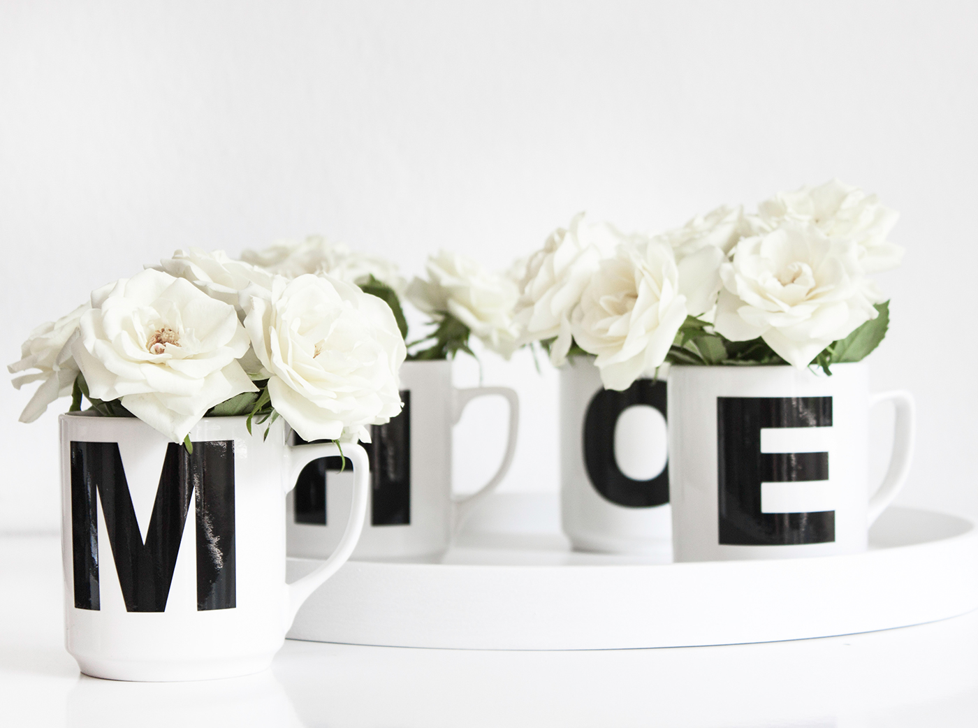 Genauso wie die Vorratsbehälter könnt ihr Kaffeebecher aus Porzellan mit Buchstaben bekleben. Ich nutze meine Tassen ausnahmsweise als Vase. Aber auch als Kaffeetasse macht sich eine Buchstabentasse ausgezeichnet. Vielleicht beklebt ihr die Tasse mit dem Anfangsbuchstaben eurer Gäste oder Familienmitglieder, dann kommt es zu keiner Verwechslung mehr.
