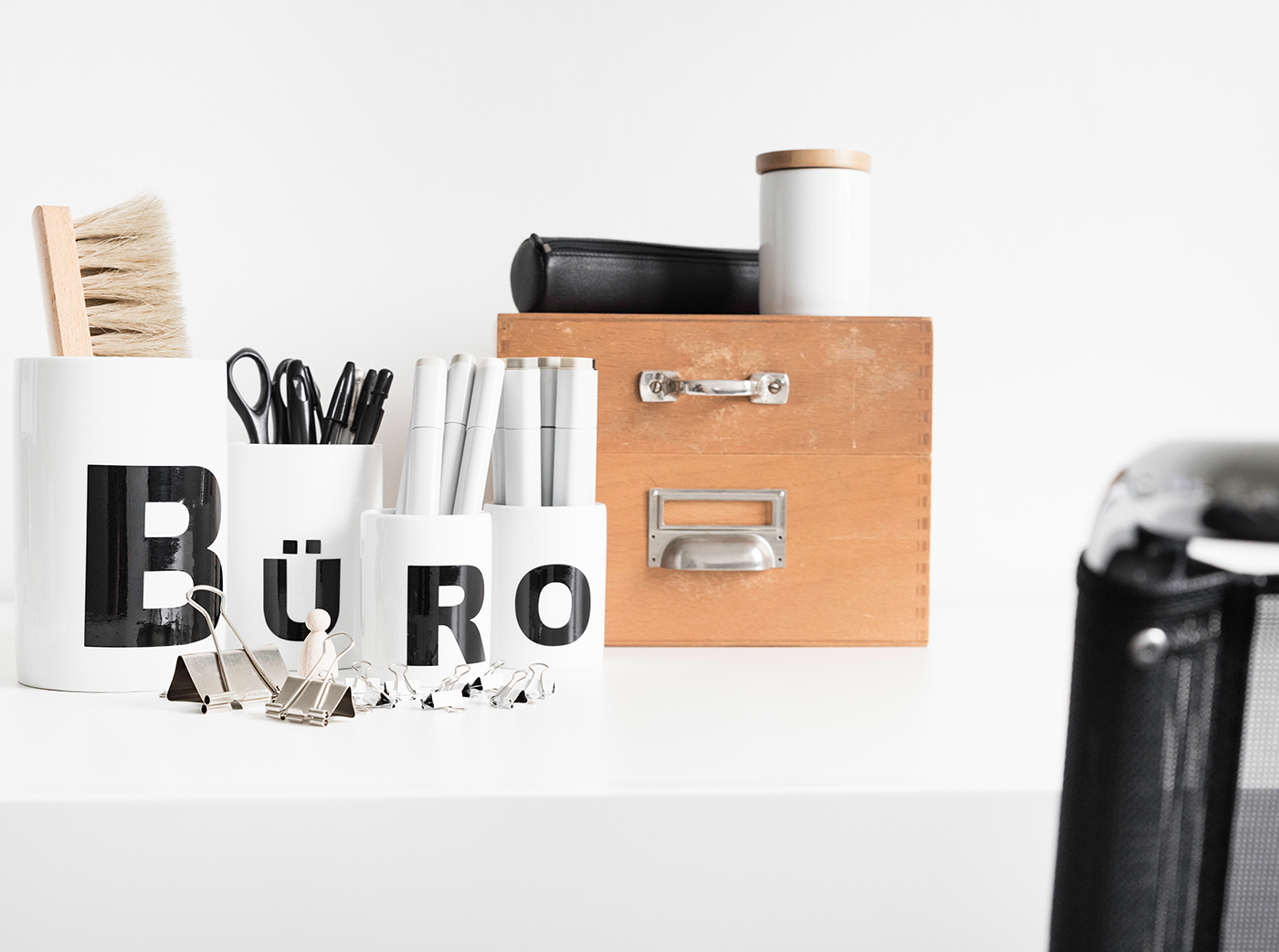 Im Büro zieht Ordnung ein. Für Stifte, Schere und Co brauchte es Behälter, damit sie griffbereit auf dem Schreibtisch stehen. Auch das Auge arbeitet mit, deshalb können genau diese Stiftköcher schön gestaltet sein.