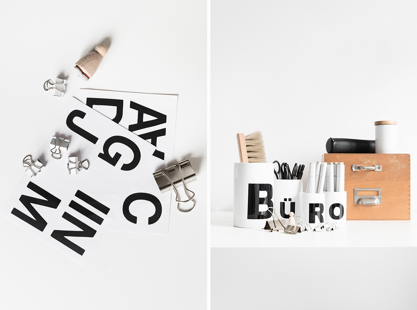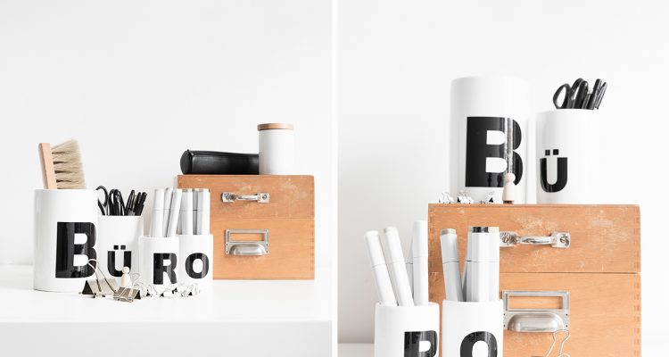 Es macht Sinn, die passenden Buchstaben für die benötige Funktion zu finden. So kann man mit Behältern oder Tassen schreiben. B Ü R O für die Stifte. Sollten die Vorratsbehälter doch noch einmal in der Küche ihren Einsatz finden, können die Buchstabe einfach wieder entfernt werden.
