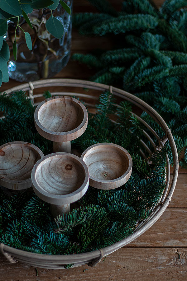 - Eukalytus Zweige auf der Tanne verteilen und ebenfalls um die Kerzenhalter herumlegen.