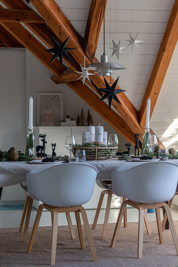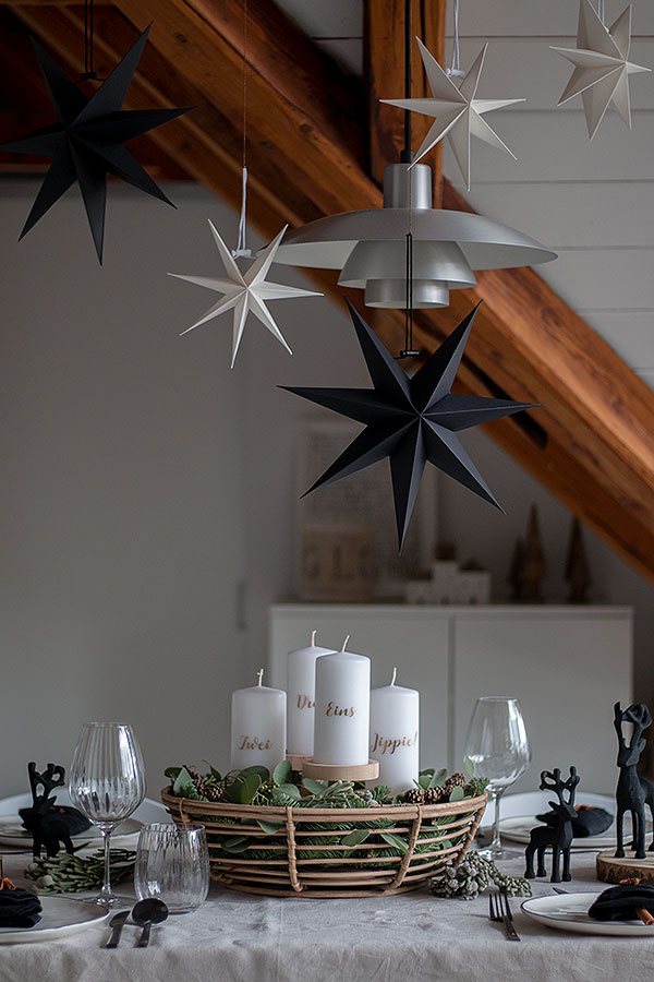Nicht nur für die Adventstischdeko, sondern auch während der gesamten Weihnachtszeit bringen Sterne nicht nur Kinderaugen zum Strahlen. Während draußen bei uns auf der Dachterrasse beleuchtete Sterne hängen, dürfen drinnen Papiersterne in unterschiedlichen Größen nicht fehlen. Besonders über dem Esszimmertisch entfalten sie ihre volle Wirkung. Dabei wirkt es spannender, wenn die Sterne in unterschiedlichen Höhen aufgehängt werden. Aber auch am Fenster machen sie eine gute Figur.