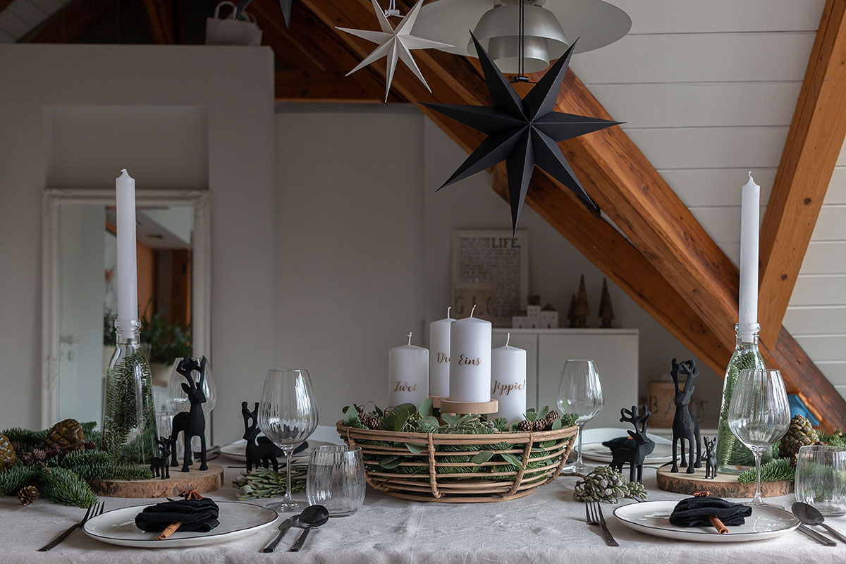- Adventstischdeko modern in schwarz, weiß, natur