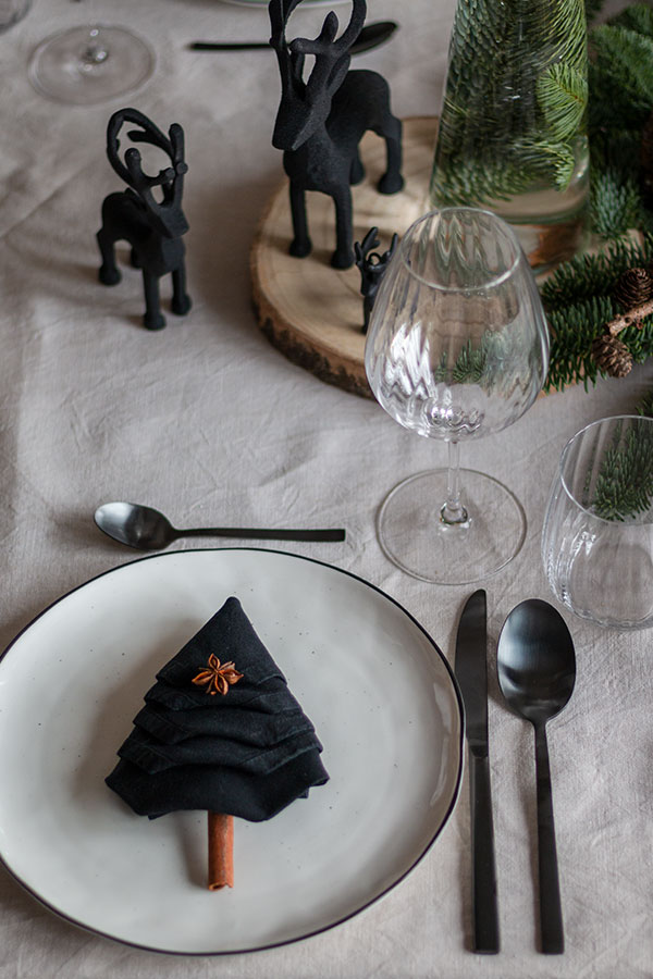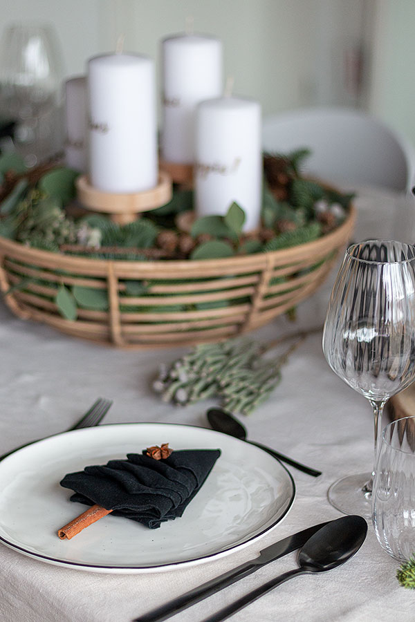 - Mit Tellern, Besteck und Gläsern eindecken und jeweils eine DIY Tannenbaumserviette auf die Teller legen.
