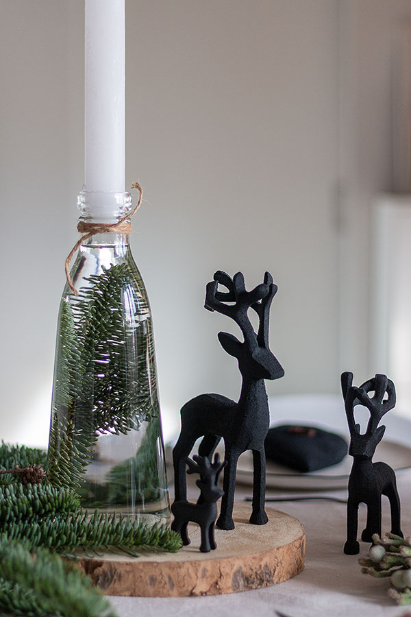 - Die Vasen mit Wasser befüllen und jeweils einen Tannenzweig hineingeben. Kerzen in die Öffnung stecken.