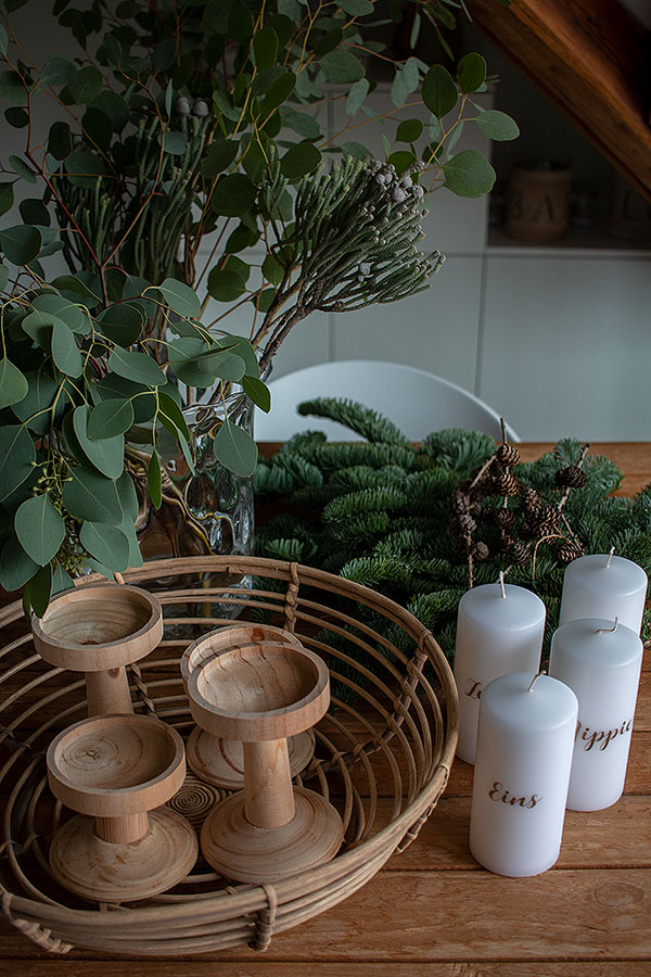 - Adventstischdeko mit Tanne, Eukalyptus und Pinienzapfen