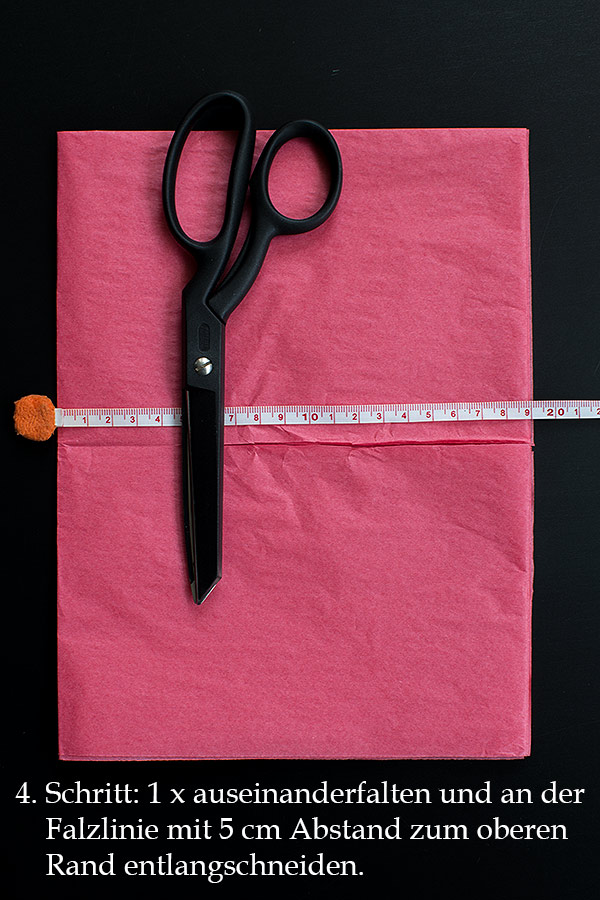 - Einmal wieder auseinanderfalten und an der Falzlinie mit 5 cm Abstand zum oberen Rand entlangschneiden.