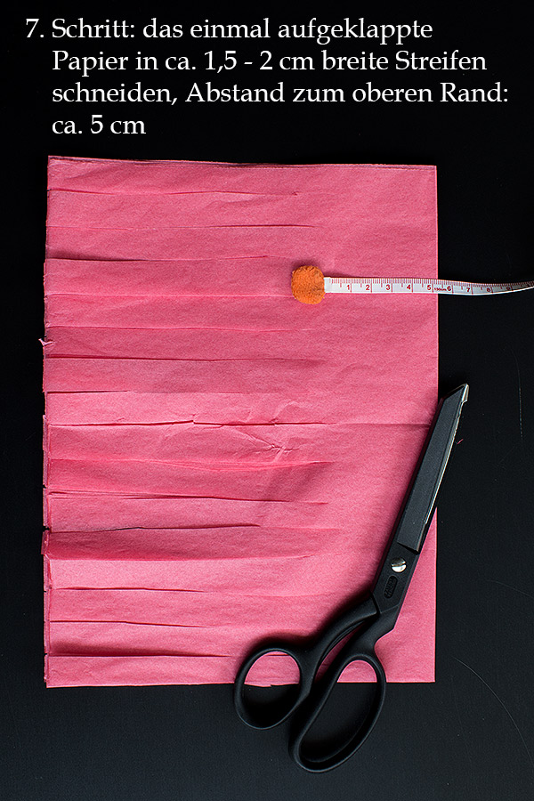 - Das einmal aufgeklappte Papier in 1,5 – 2 cm breite Streifen schneiden. Abstand zum oberen geschlossenen Rand: 5 cm.